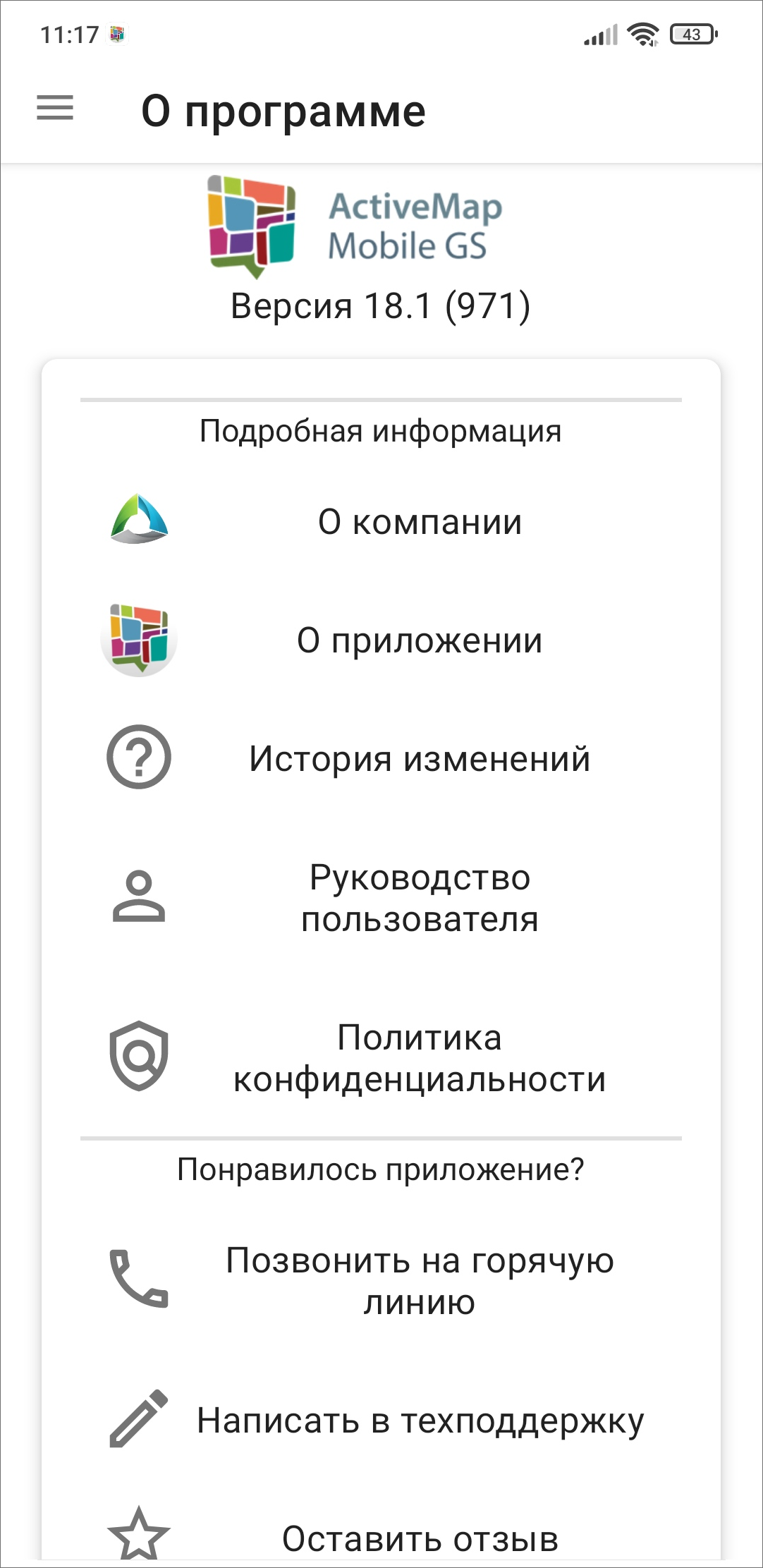 При выборе раздела «О компании» отобразится краткая информация о компании ООО «ГрадоСервис». В нижней части окна будет доступна кнопка «Подробнее о компании», которая содержит ссылку https://gradoservice.ru/contacts для перехода на сайт для получения более подробной информации. При выборе раздела «О приложении» отобразится информация о функциях и возможностях приложения. В нижней части окна будет расположена кнопка «Подробнее о комплексе «ActiveMap»», которая содержит ссылку https://gradoservice.ru/products/activemap для перехода на сайт компании и просмотра подробной информации о программном комплексе «ActiveMap», в состав которого входит данное приложение. Выбор раздела «История изменения» позволит отобразить информацию о произведенных доработках и изменениях функционала в версиях приложения. Выбор раздела «Руководство пользователя» позволит открыть и сохранить актуальное подробное руководство пользователя по работе в данном приложении в формате pdf. Выбор раздела «Политика конфиденциальности» откроет ссылку на веб-страницу с политикой конфиденциальности ООО «ГрадоСервис»: https://gradoservice.ru/policies/privacy?lang=ruru. Внимательно изучите нашу Политику конфиденциальности, чтобы знать, какие сведения мы собираем, в каких целях их используем.