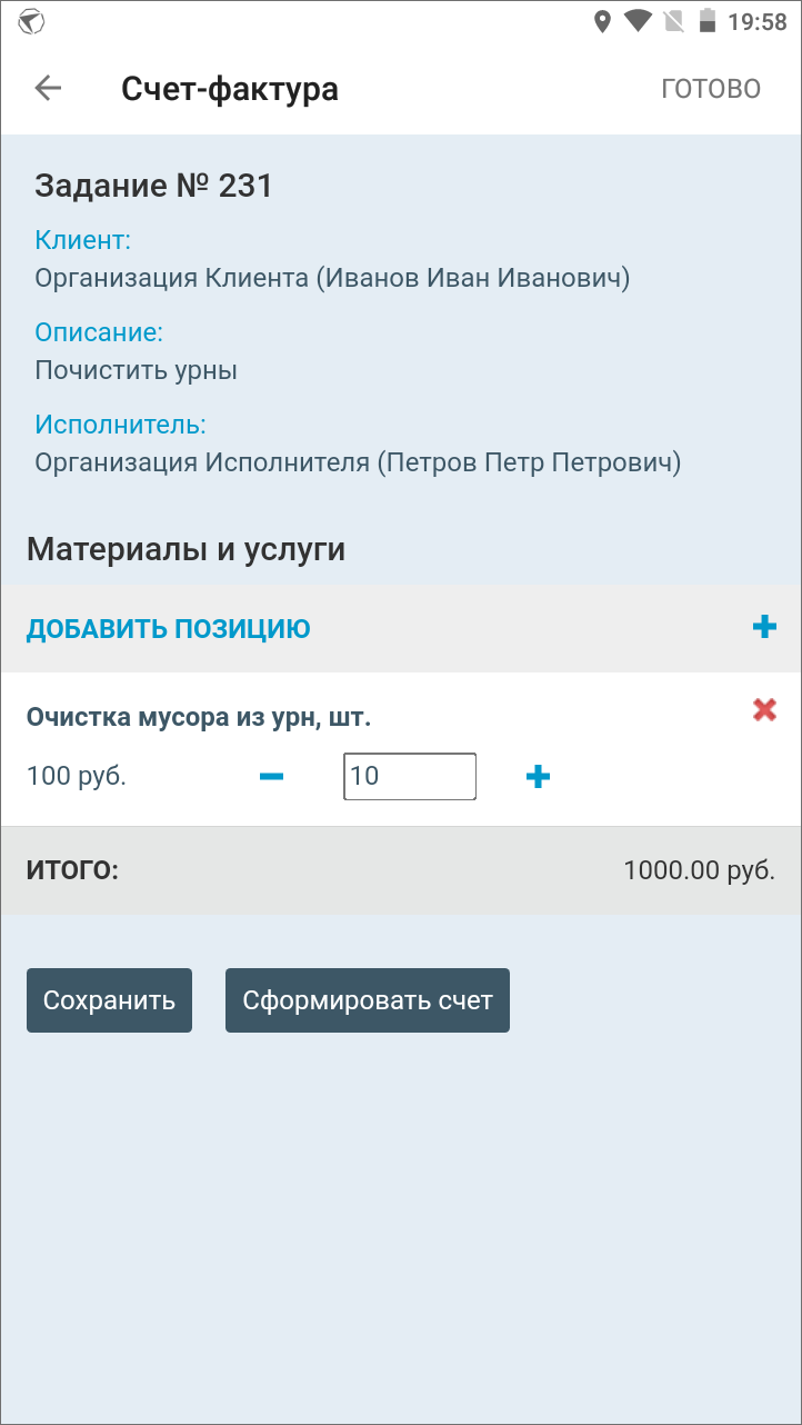 Для добавления других позиций в счете повторите указанные шаги. Чтобы изменить количество материалов и услуг, воспользуйтесь кнопками увеличения/уменьшения количества в области добавленных материалов и услуг. Чтобы удалить позицию из счета, нажмите на крестик в блоке с позицией. После добавления всех позиций следует запустить создание счет-фактуры, нажав «Сформировать счет». При успешном создании счет-фактуры выйдет сообщение: «Счет сформирован и прикреплен к заданию». Чтобы вернуться к созданию/редактированию задания, нажмите «Готово». Есть возможность сохранить изменения в счет-фактуре. При выходе из окна «Счет-фактура» приложение выдаст предупреждение, если будут несохраненные изменения в расчетах.