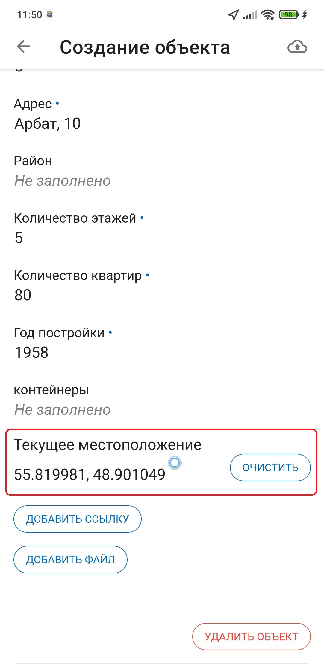 , заполнить атрибуты и координаты, добавить файлы и ссылки при необходимости. Блок «Текущее местоположение» заполняется автоматически, если на телефоне включено определение местоположения и приложению дано разрешение на определение геолокации. При неактивной геолокации данное поле остается незаполненным. Реализована возможность остановки автоопределения текущего местоположения и удаления существующих координат объекта. Для этого нужно перейти в блок «Текущее местоположение» и нажать «Очистить». Координаты будут удалены, появится надпись «Не заполнено». При повторном выборе блока откроется карта, где можно будет разместить объект в нужном месте (Рис. 2.86). При необходимости операцию можно повторить.