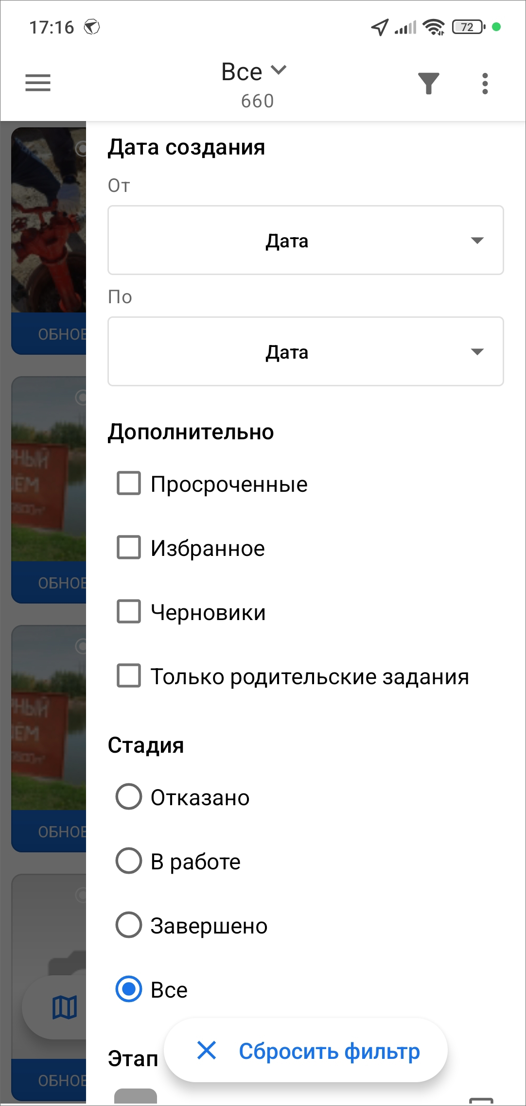 стадии заданий - все возможные стадии заданий в системе (отказано, в работе, завершено, все);