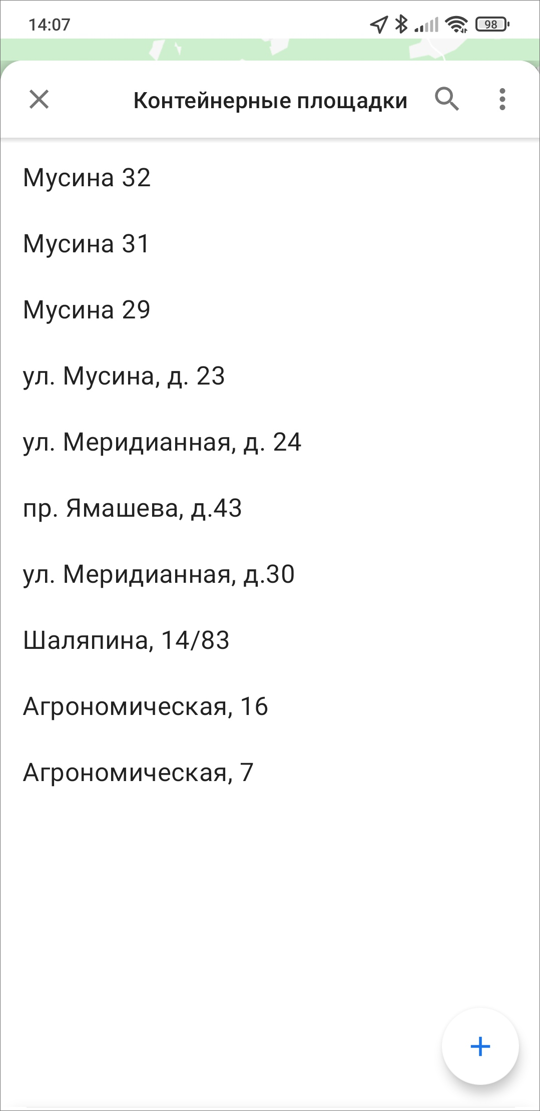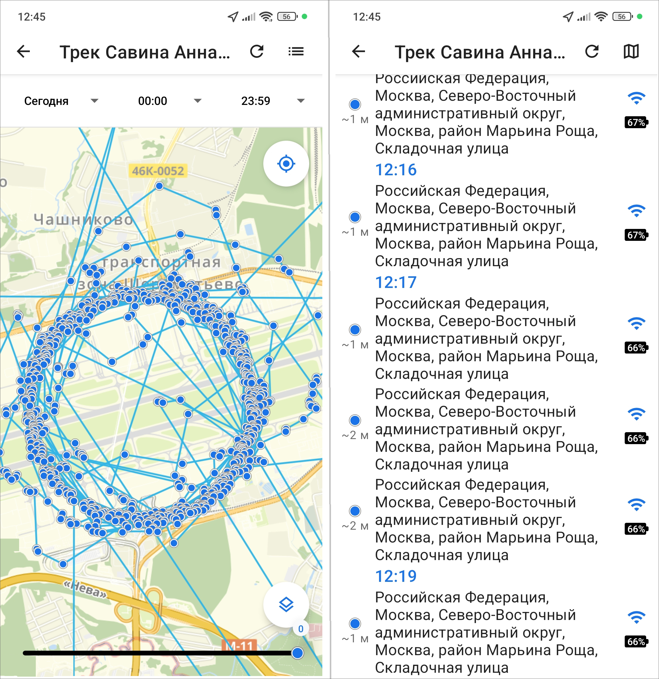 , выбрать интересующие день и временной промежуток. Отобразится трек, для которого имеется возможность передвигать маркер местоположения пользователя и просматривать информацию в каждой точке передвижения. Трек будет отображен на карте, но можно посмотреть точки трека в виде списка (Рис. 2.100). Для этого нужно нажать