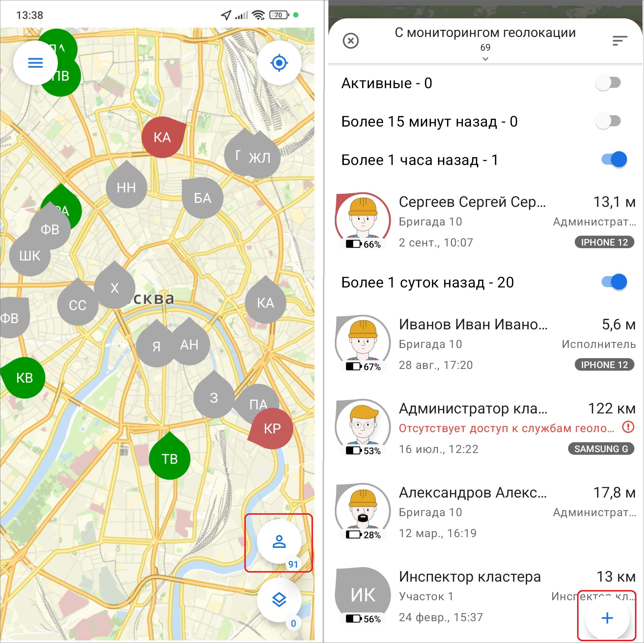 местоположение сотрудников — пользователи отображаются пиктограммами разных цветов, в зависимости от последней активности,