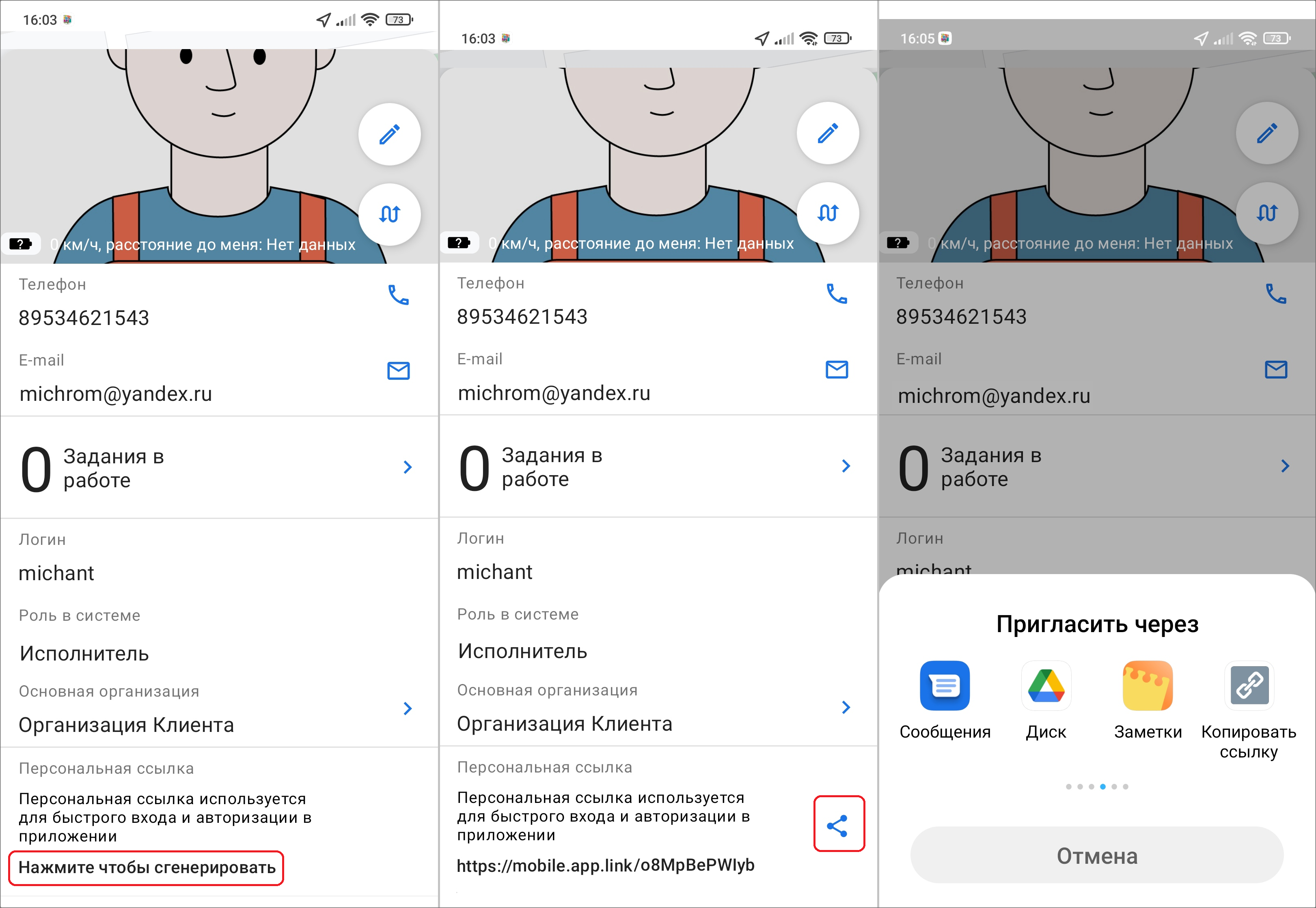 В системе появится новый пользователь. Чтобы отправить сотруднику ссылку, нужно зайти в его профиль, сформировать персональную ссылку и отправить ее сотруднику через любой удобный мессенджер (Рис. 2.103). Ссылку можно создать для любого зарегистрированного пользователя неограниченное число раз.