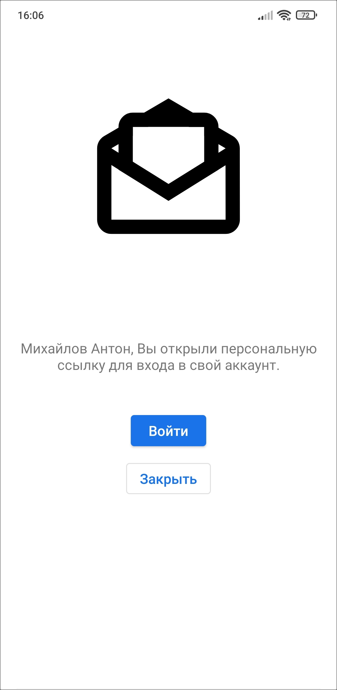 Сотрудник, получив ссылку, откроет ее и сразу же авторизуется в приложении, если приложение установлено на его устройстве (Рис. 2.104). Если же приложение не установлено, то ссылка откроется в магазине GooglePlay и авторизация произойдет после установки приложения.