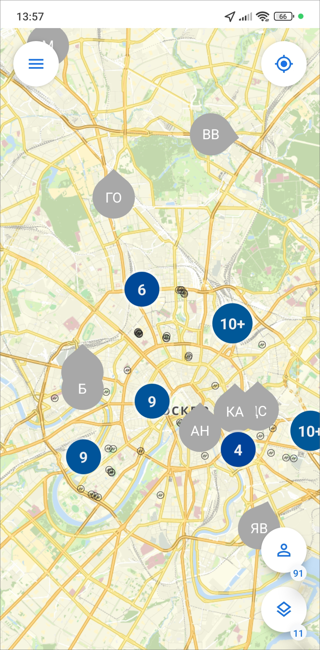 оранжевый цвет - координаты, отправленные на сервер менее 60 минут назад,