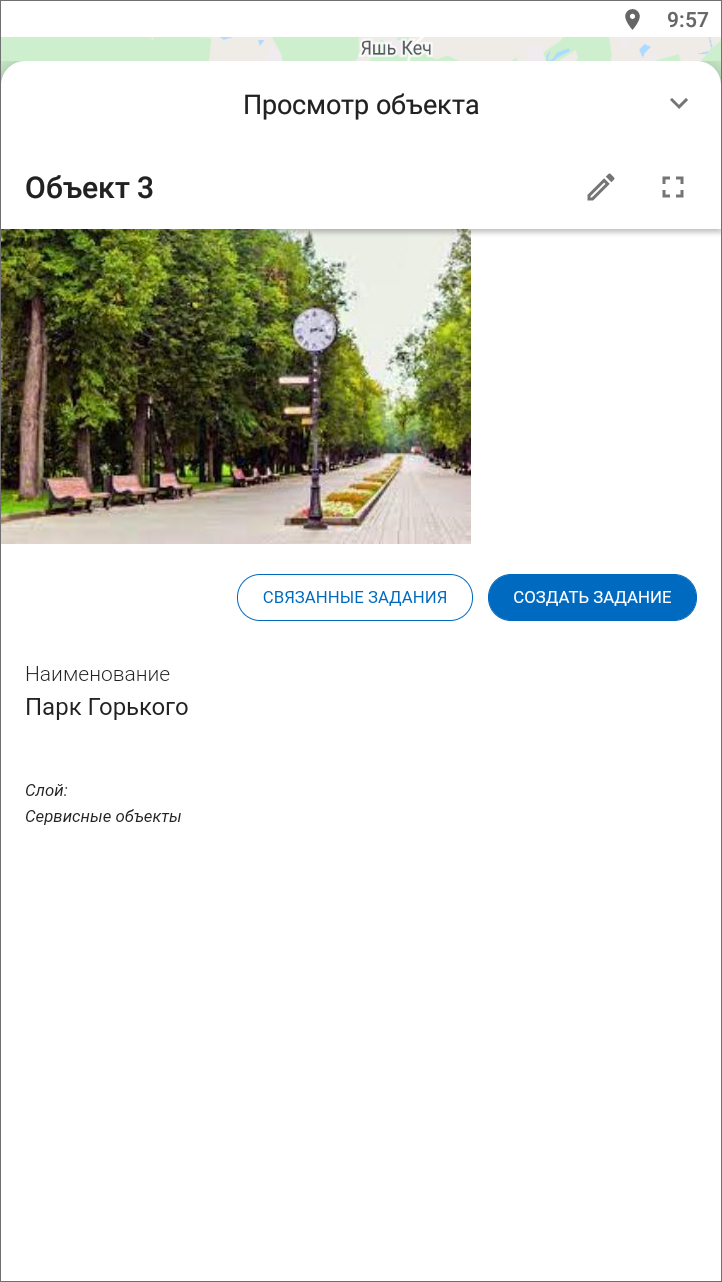 . Для получения атрибутивной информации (списка слоев, объектов, их атрибутивных данных и медиафайлов) в выбранной точке карты необходимо обозначить точку на карте касанием пальца экрана. Отобразится информационное окно «Просмотр объектов» со списком слоев и объектов, которые находятся в обозначенной точке карты. В данном окне также будет содержаться информация о количестве объектов слоев, находящихся в выбранной точке. Для получения подробной атрибутивной информации по объекту необходимо выделить объект в списке нажатием пальца на экран. Откроется окно «Просмотр объекта». В приложении есть возможность добавлять, редактировать и удалять объекты слоя, если пользователю выданы права (подробнее в разделе Объекты). Для редактирования или удаления объекта нужно нажать