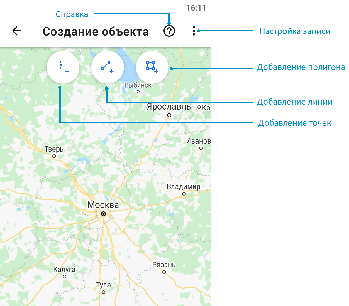 В меню окна «Создание объекта» есть раздел «Настройки записи» для настройки минимального расстояния и времени между соседними точками во время записи трека маршрута. После выбора типа геометрии и нажатия соответствующей кнопки («Добавление точек», «Добавление линии» или «Добавление полигона») произойдет переход к режиму добавления объекта.