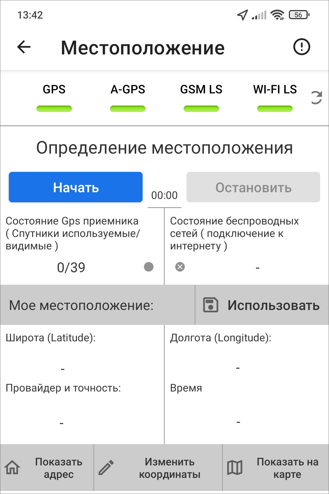 Для определения местоположения с помощью выбранных источников необходимо нажать «Начать». Начнется процесс определения местоположения устройства, запустится таймер, в поле «Состояние GPS-приемника» отобразится количество используемых и видимых спутников GPS (Рис. 2.80). После определения местоположения отобразится соответствующее сообщение, а процесс определения (уточнения) местоположения будет продолжен. В поле «Мое местоположение» отобразятся найденные координаты (в системе координат на эллипсоиде WGS 84 - Широта/Долгота - EPSG:4326) и точность найденных координат в метрах. Для остановки процесса определения и уточнения местоположения необходимо нажать «Остановить». Для использования найденных координат с полученной точностью необходимо нажать «Использовать».