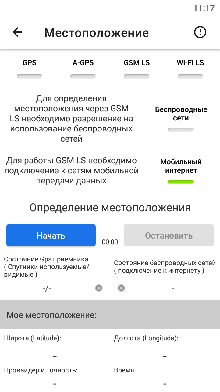 Сообщения «Локация по сети отключена!», «GPS отключен!» уведомляет пользователя о том, что не все настройки определения местоположения были выполнены. Для настройки источников определения местоположения необходимо перейти к окну «Местоположение», которое откроется, если нажать «Настройки местоположения»