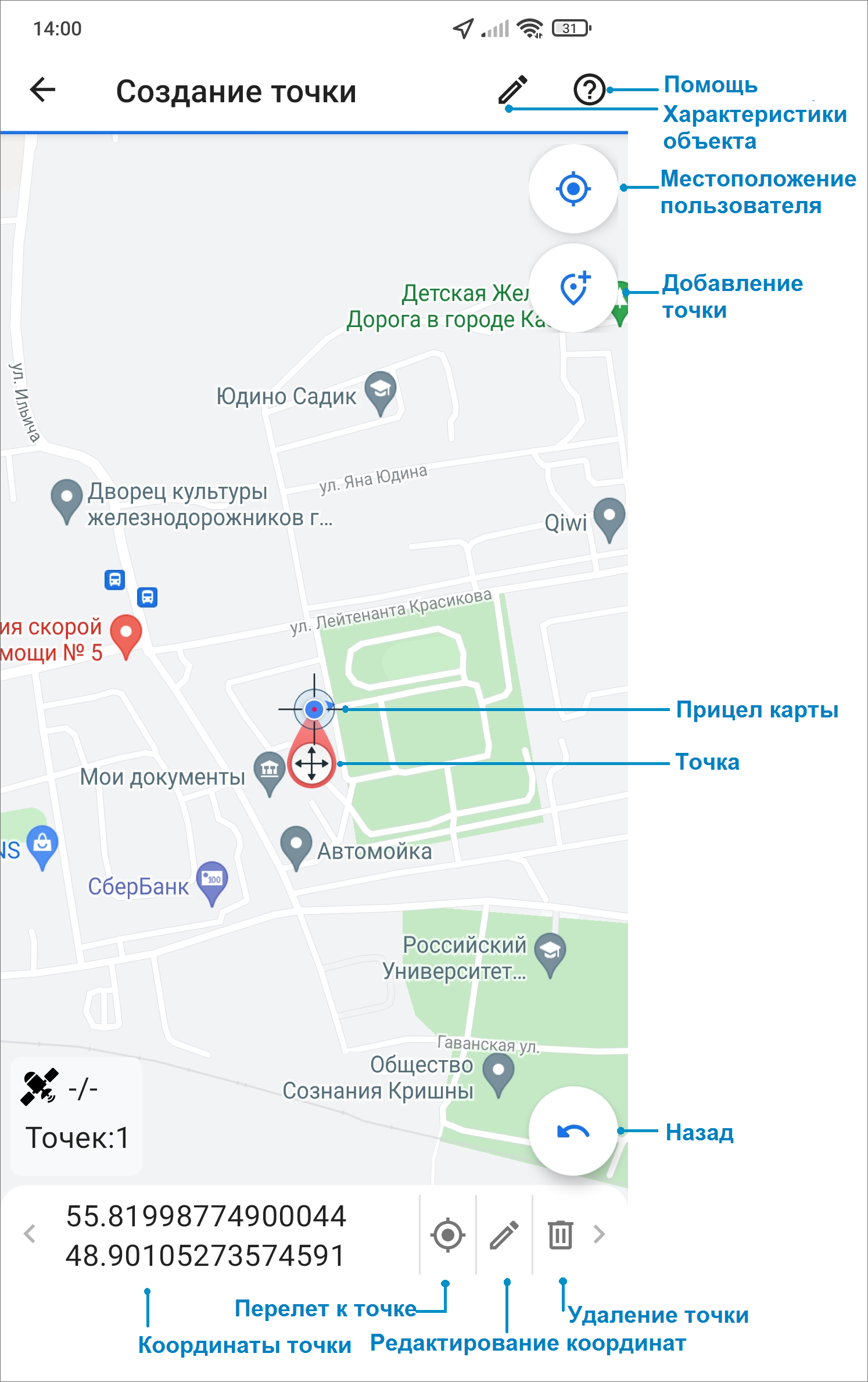 Далее для редактирования координат выделенной точки можно ее переместить - для этого необходимо выполнить длительное нажатие на точку и переместить в другое место или можно вручную нажать «Редактировать» и в открывшемся окне поправить координаты точки. Для удаления точки следует нажать «Удалить». После добавления и редактирования точек можно добавить название и описание точки, для этого следует нажать «Редактировать»