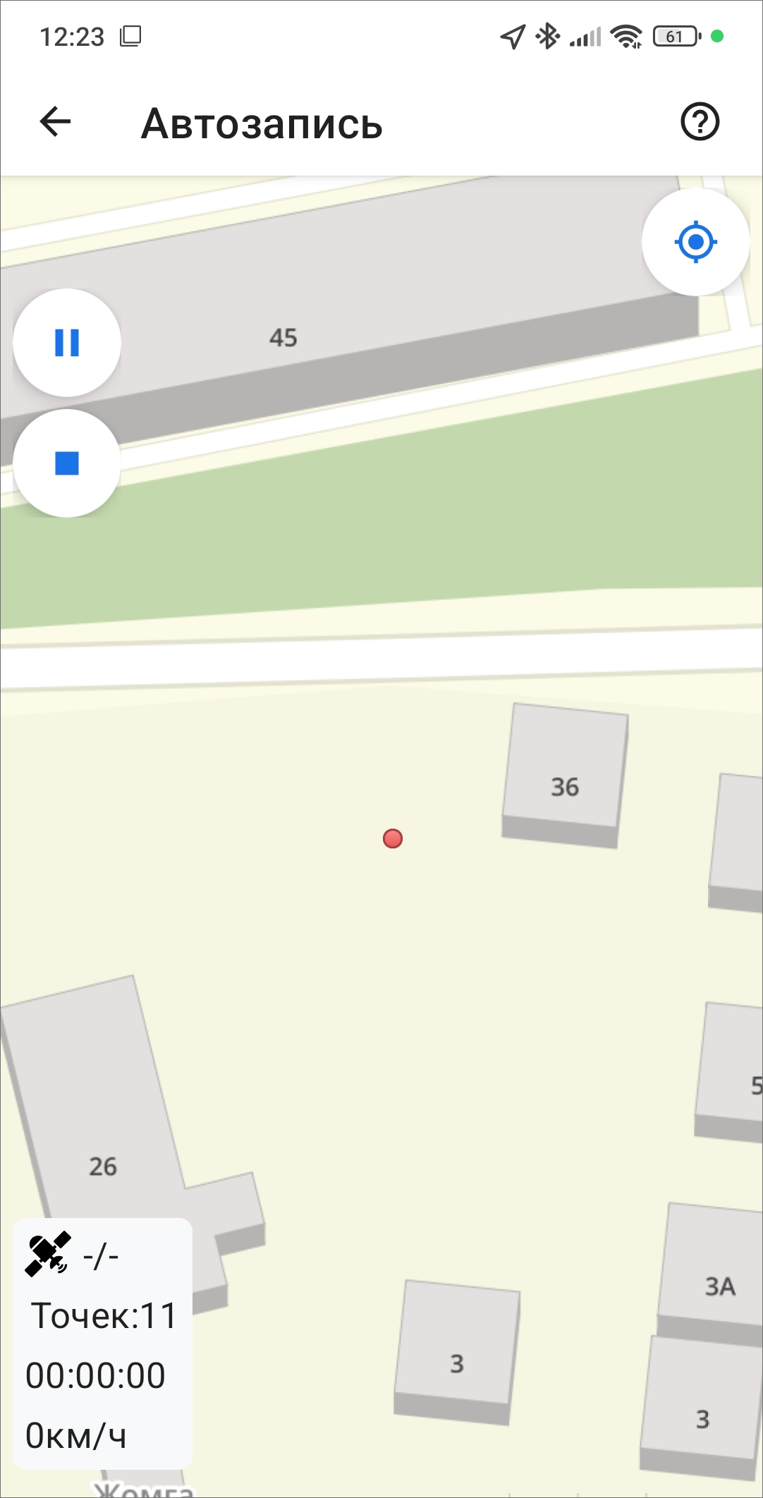для управления процессом записи. В процессе записи в окне карты отображаются следующие параметры: количество видимых спутников GPS из количества доступных спутников GPS, время записи трека, количество найденных точек.