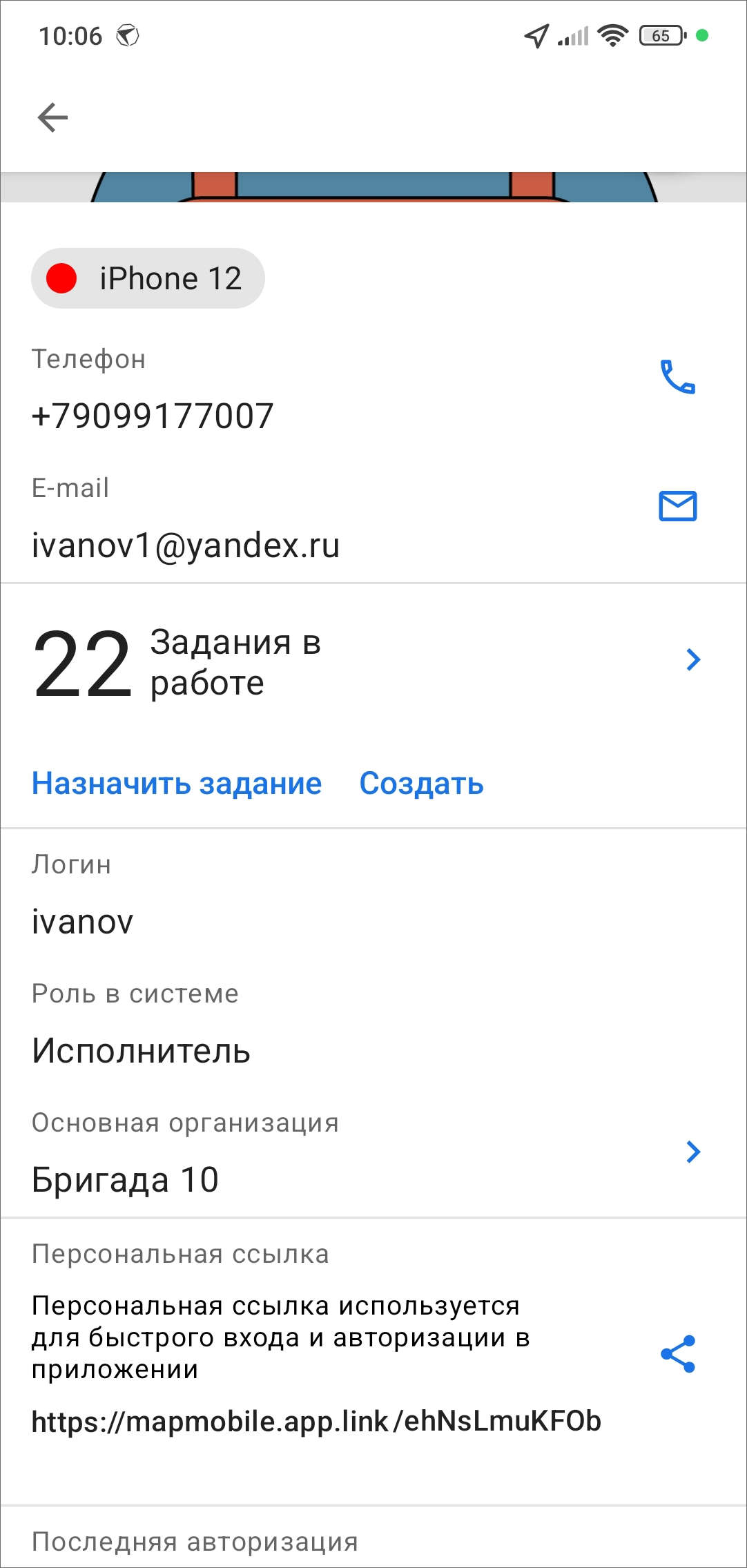 При выборе «Импортировать из контактов» откроется список контактов устройства пользователя (предварительно нужно выдать запрашиваемое разрешение). С помощью строки поиска можно найти нужный контакт. Затем отметить его галочкой (можно выбрать несколько) и нажать «Готово». При необходимости можно выделить контакт и перейти в окно редактирования будущего профиля сотрудника, где есть возможность внести изменения. Для быстрого импорта контактов нужно нажать «Создать». По умолчанию в системе создается учетная запись с ролью «Исполнитель», тип «Человек», логин и пароль генерируются автоматически. В открывшемся окне отобразится созданный пользователь. Если нажать кнопку «Поделиться», можно отправить ссылку сотруднику для авторизации в приложении (Рис. 2.69).
