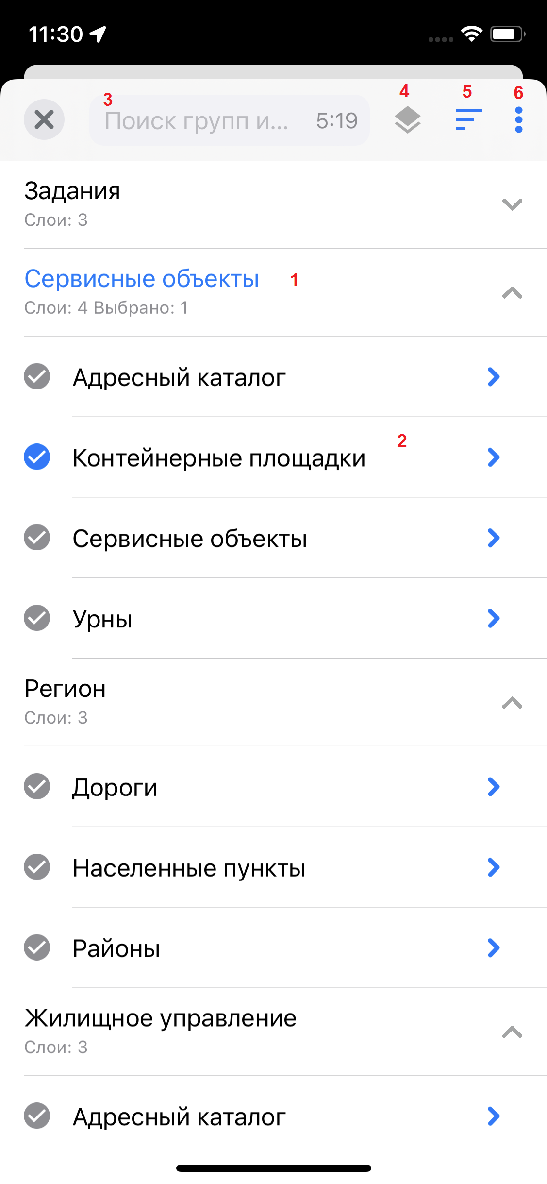 Под каждой группой слоев отображается количество слоев. При нажатии на строку с именем группы отображается список слоев группы.