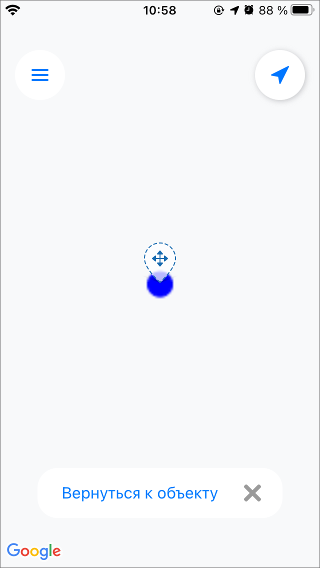 . Откроется окно просмотра местоположения объекта (Рис. 2.88). В данном окне можно увеличивать и уменьшать масштаб жестом «pinch» (развести/свести пальцы), выйти в боковое меню, перелететь к своему местоположению и вернуться к окну просмотра объекта, нажав «Вернуться к объекту».