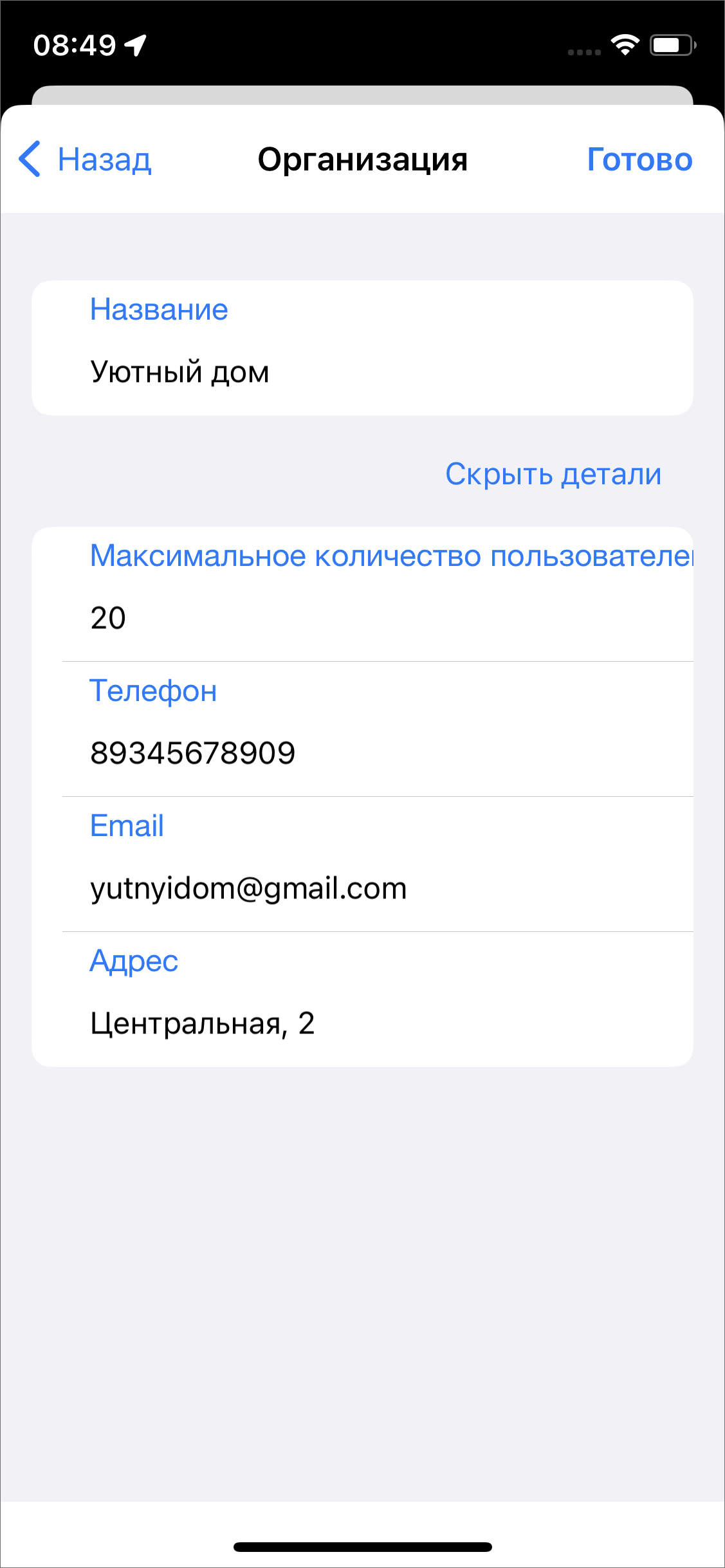 Следует заполнить только название или нажать «Показать детали» и заполнить все предложенные поля, далее нажать «Готово» (Рис. 2.65). Организация появится в списке организаций и автоматически подставится в значение поля «Основная организация». Чтобы изменить организацию пользователя на новую, нужно нажать «Готово», чтобы отменить - выйти из профиля пользователя без сохранения изменений.