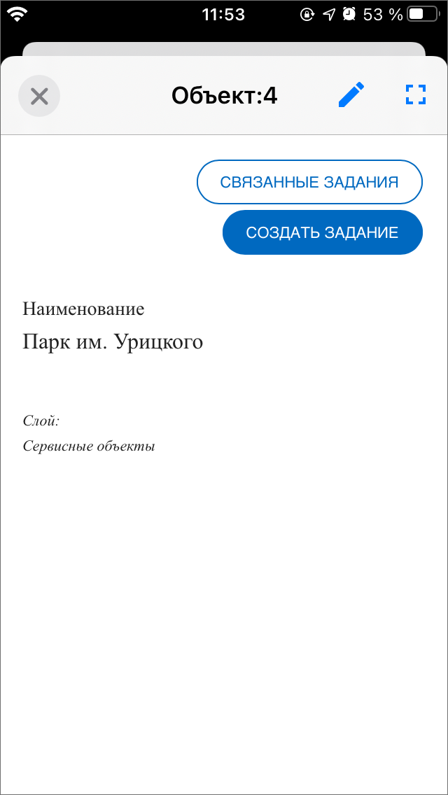 В окне списка объектов обслуживания можно выбрать нужный объект касанием. В открывшемся окне просмотра объекта отображается наименование объекта и слоя, к которому он принадлежит (Рис. 2.75). Здесь же отображаются (при наличии) фото, ссылки и прикрепленные файлы. В данном окне можно перелететь к объекту, нажав кнопку