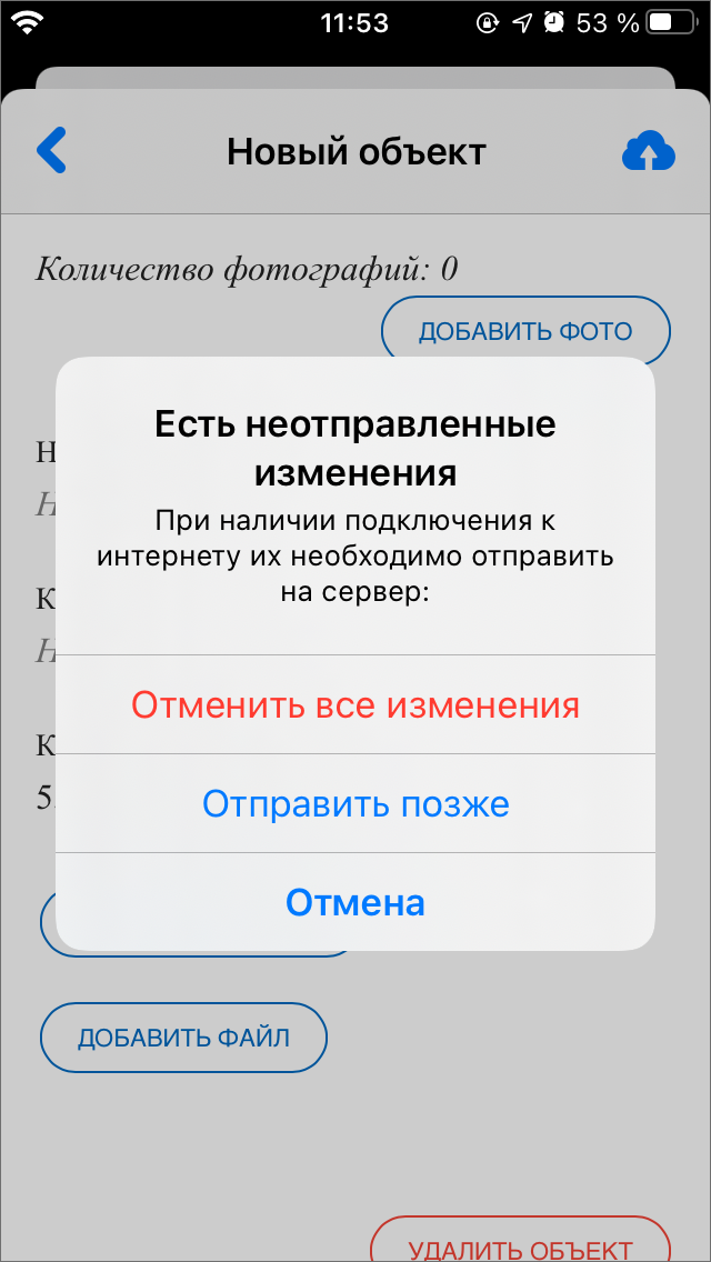 В том случае, если в черновик нужно внести изменения перед отправкой на сервер, нужно открыть окно объекта, нажав на строку объекта. В открывшемся окне поля, изменения в которых не были отправлены на сервер, будут отмечены синей точкой справа от названия поля. После внесения необходимых изменений нужно нажать