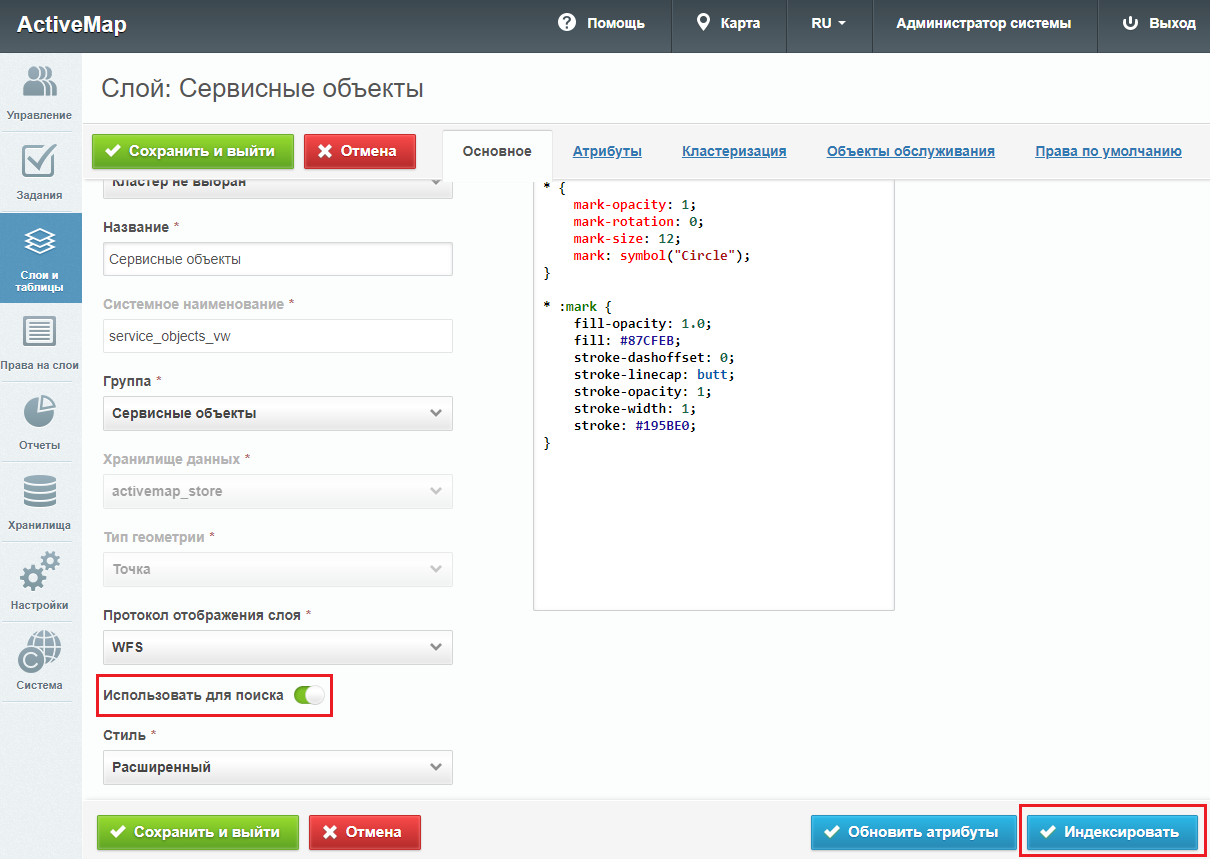 При ошибке отправления изменений объектов обслуживания нужно обновить настройки слоя в «MapSurfer». Отключить поиск по слою, сохранить слой. Далее снова открыть настройки, включить поиск по слою и нажать «Индексировать».
