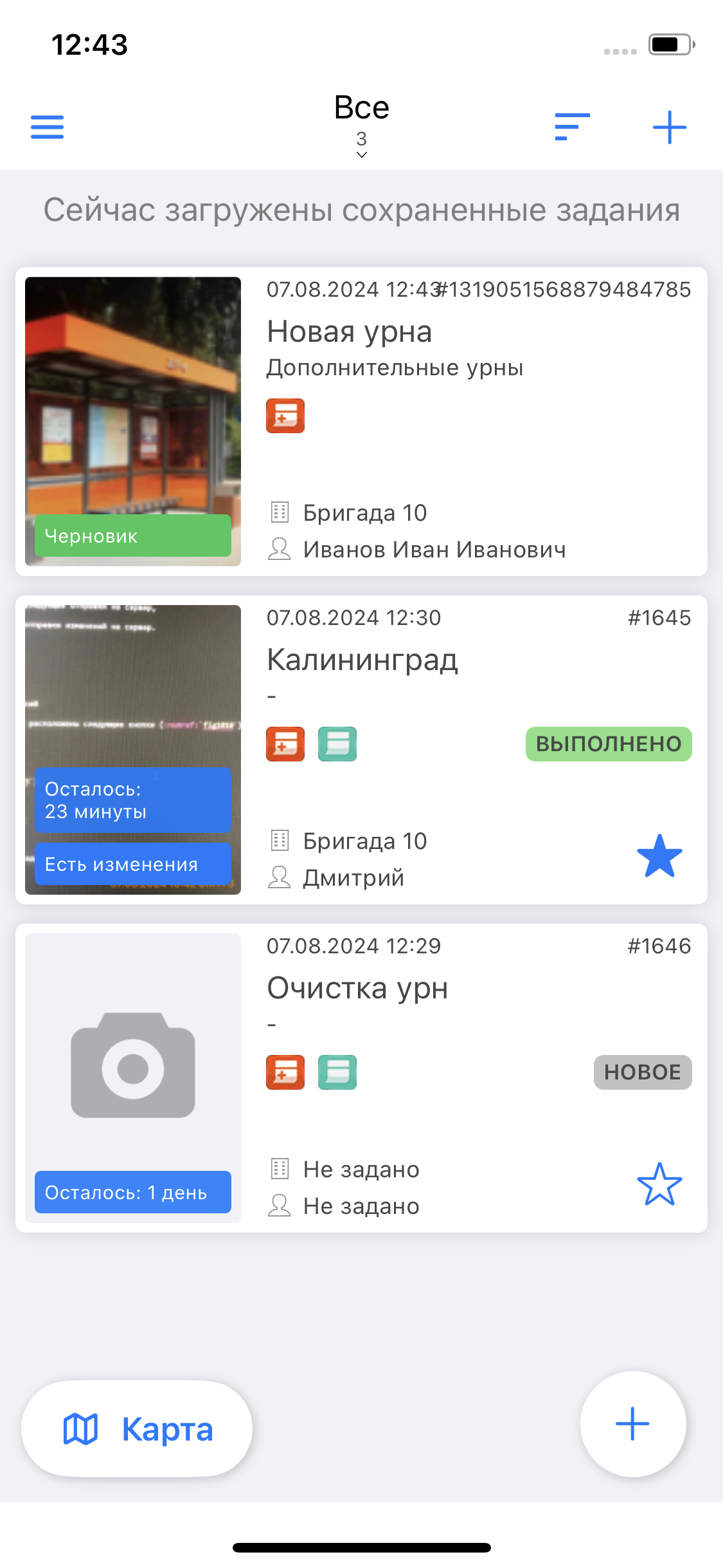 Для того чтобы иметь доступ ко всей информации по заданию в офлайн-режиме (в том числе к фотографиям и файлам), в приложении реализована загрузка заданий. Для этого пользователю перед выездом, пока есть доступ к сети Интернет, нужно открыть нужные задания (например, назначенные на него). Все открытые задания будут доступны офлайн. Если нужно будет добавить объект обслуживания или заполнить настраиваемое поле формата «Объекты данных», то следует дополнительно загрузить необходимые слои в кэш (подробнее в разделе Объекты обслуживания).
