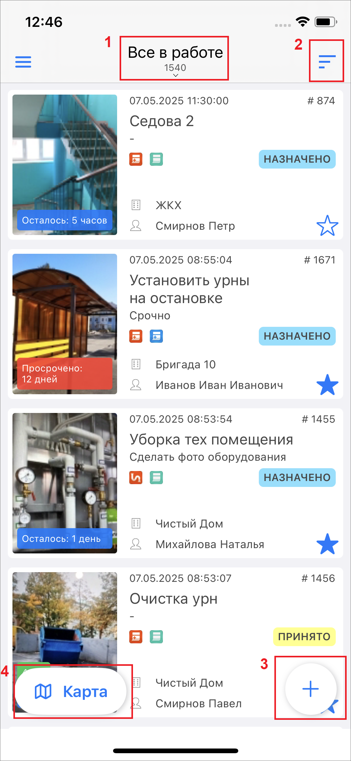 Просмотр заданий возможен в виде списка и на карте (Рис. 2.28). Просмотр заданий на карте доступен только в онлайн-режиме. При этом установленные в списке заданий фильтры применяются автоматически и на карте. Чтобы перейти от списка к карте, необходимо нажать на кнопку «Карта»
