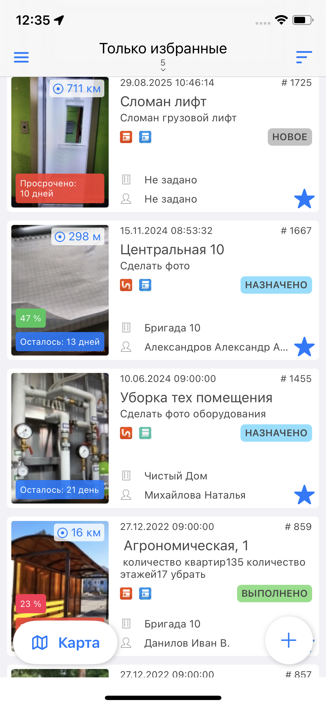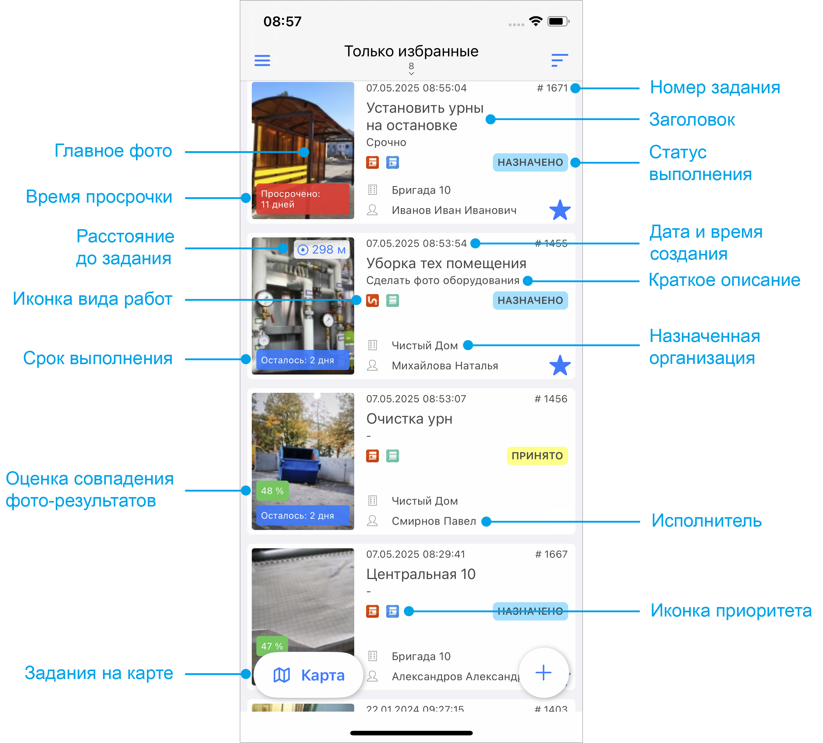 На карте можно открыть карточку конкретного задания, нажав на точку. В открывшемся окне можно внести изменения и отправить их на сервер, а затем вернуться обратно к карте заданий и продолжать работу с заданиями.