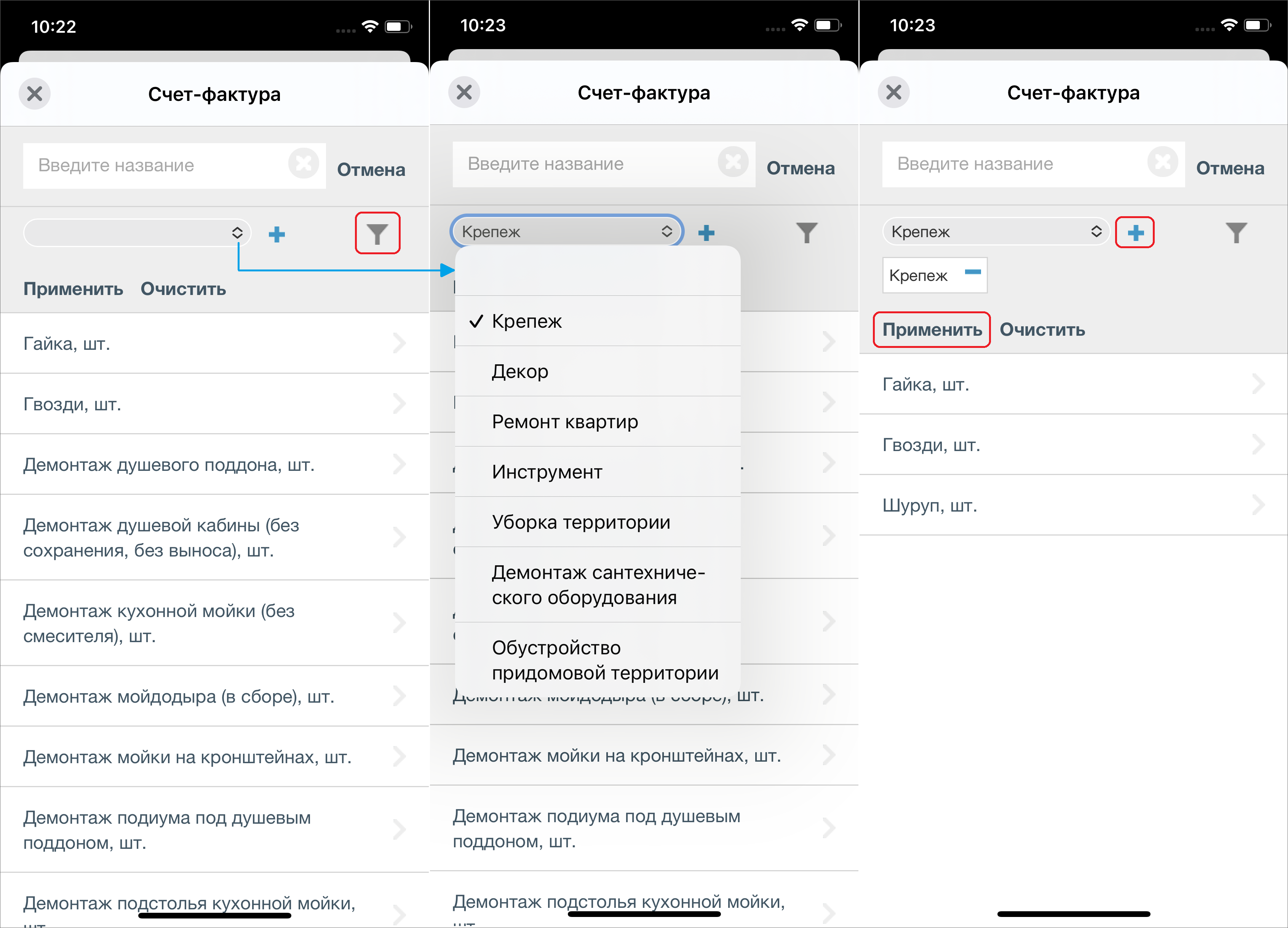 В окне выбора материалов и услуг можно воспользоваться поиском, который будет выдавать подходящие результаты при вводе текста (Рис. 2.127). Для добавления материала или услуги в счет нужно нажать на интересующий пункт.