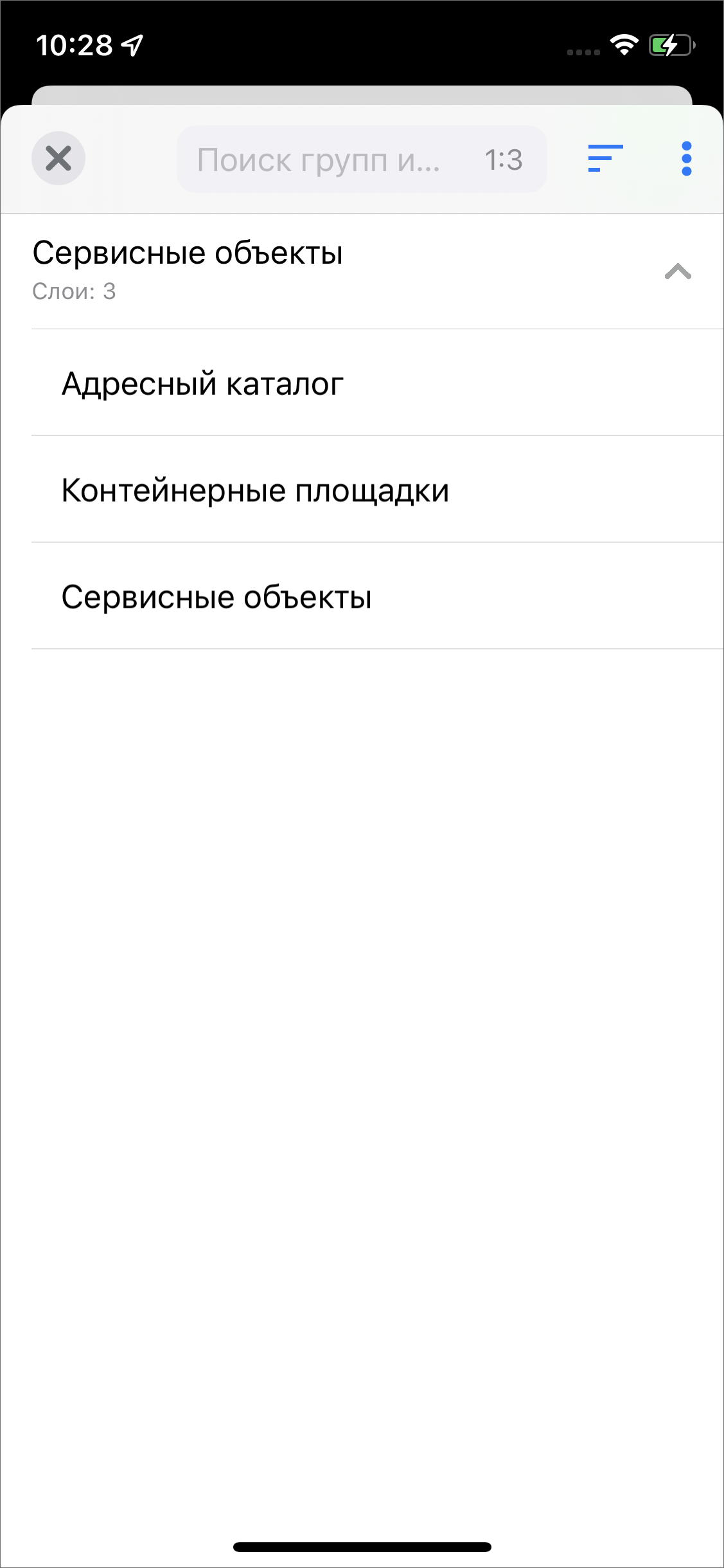 В выпадающем списке выбора слоя с объектами обслуживания представлены группы сервисных слоев с содержащимися в них слоями. Здесь представлены слои, отмеченные администратором как сервисные. В строке каждой группы отмечено, сколько слоев содержит группа. В верхней части окна есть строка поиска, с помощью которой можно искать группы и слои по их названиям. Кроме того, справа от поисковой строки расположена кнопка сортировки
