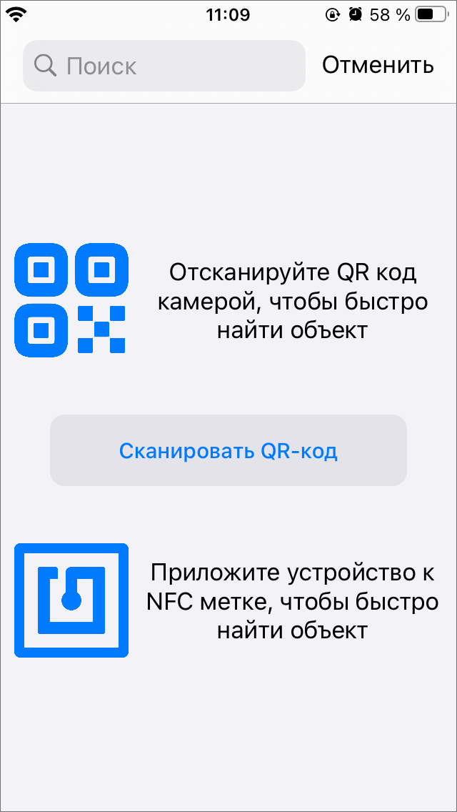 открывается окно поиска объекта обслуживания (Рис. 2.73), в котором можно воспользоваться стандартной строкой поиска, а также поиском с помощью QR-кода и NFC метки. Для того чтобы воспользоваться поиском объекта обслуживания с помощью QR-кода, нужно нажать «Сканировать QR-код», после чего приложение откроет встроенную камеру устройства пользователя для сканирования. При этом для объекта обслуживания заранее должен быть создан QR-код. Для поиска объекта с помощью метки NFC нужно поднести устройство пользователя к метке NFC объекта.