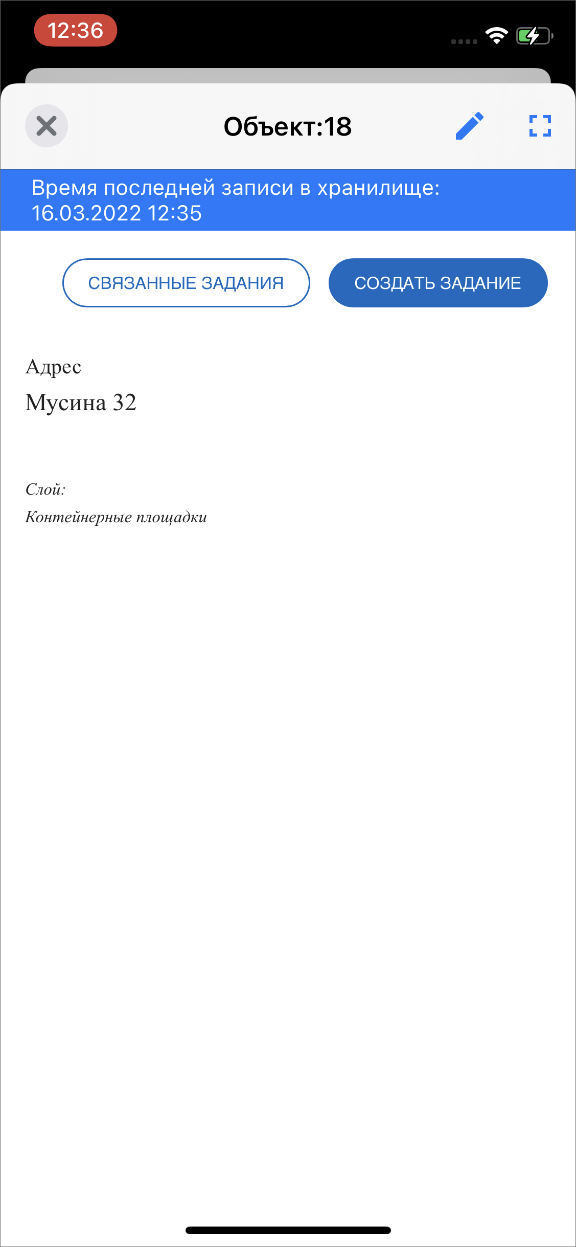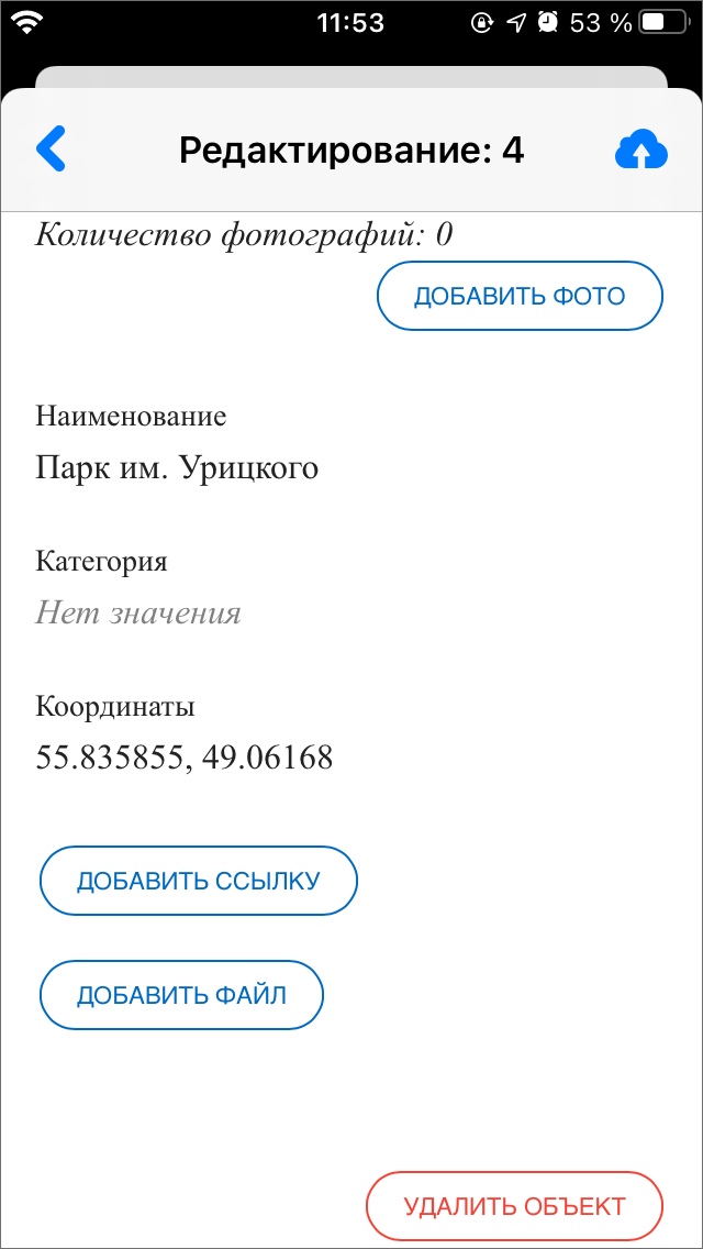 В том случае, если в черновик нужно внести изменения перед отправкой на сервер, нужно открыть окно объекта, нажав на строку объекта. В открывшемся окне поля, изменения в которых не были отправлены на сервер, будут отмечены синей точкой справа от названия поля. После внесения необходимых изменений нужно нажать