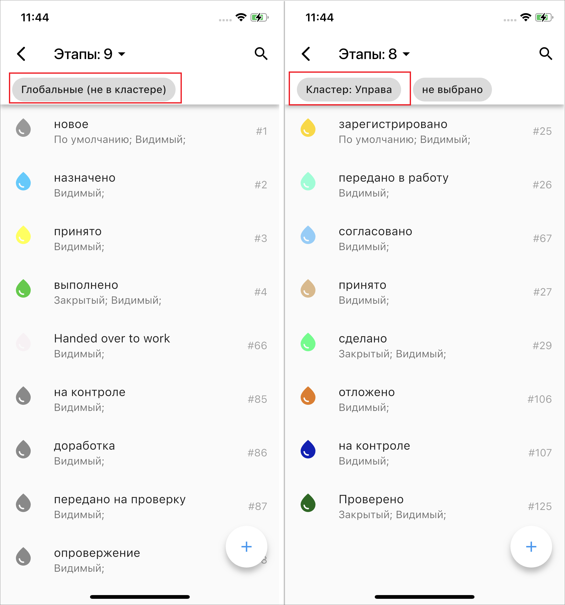 Если у кластера нет этапов и создаётся первый, то ему автоматически присваивается значение «по умолчанию». Удалить этап «по умолчанию» нельзя. Снять галочку «по умолчанию» с этапа тоже нельзя. Если отметить другой этап «по умолчанию», то с предыдущего этапа данная галочка будет автоматически снята. Этапом «назначено» будет считаться первый не «по умолчанию» и не закрывающий этап. Если такого этапа нет, смены этапа при назначении исполнителя не произойдет.
