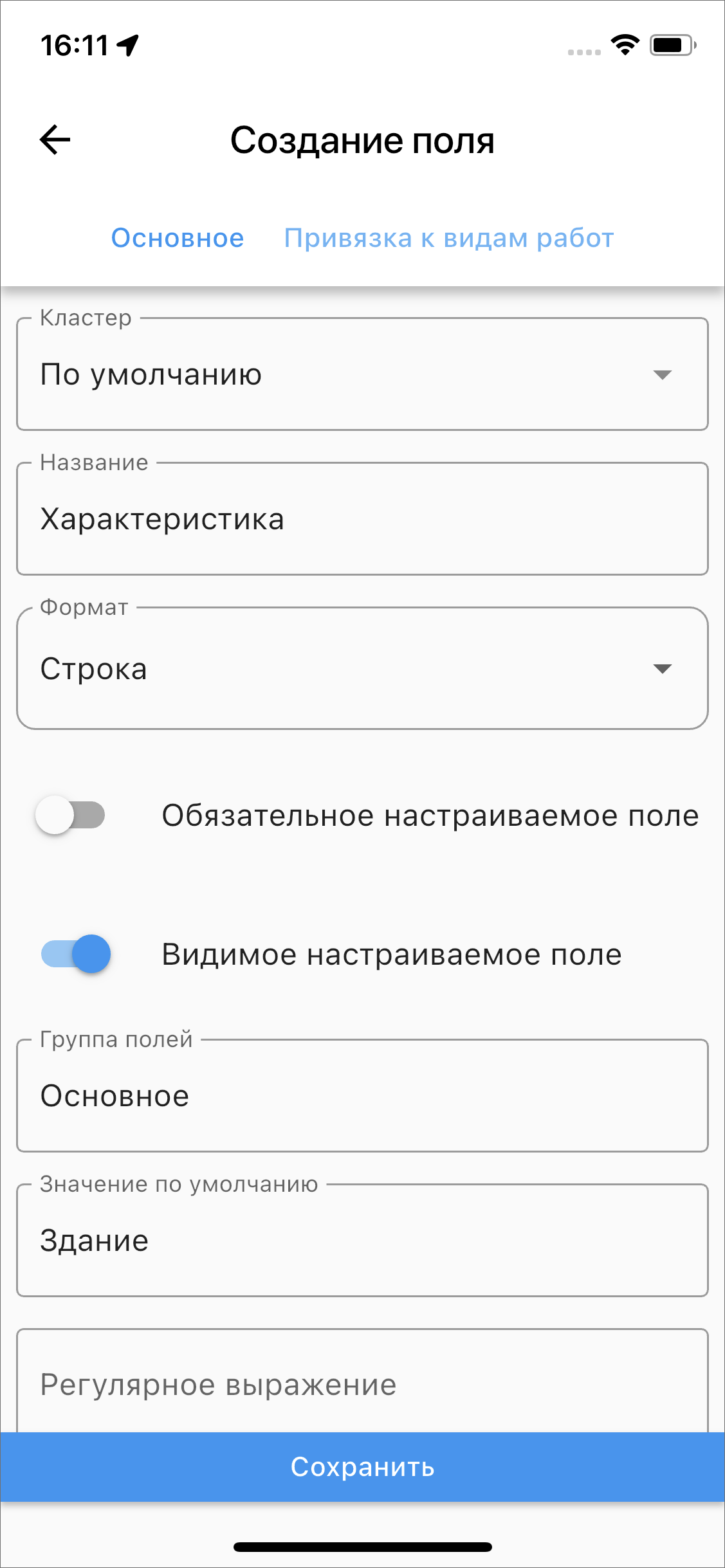 Для редактирования настраиваемого поля следует открыть его, внести изменения во вкладках «Основное» или «Привязка к видам работ» и сохранить их.