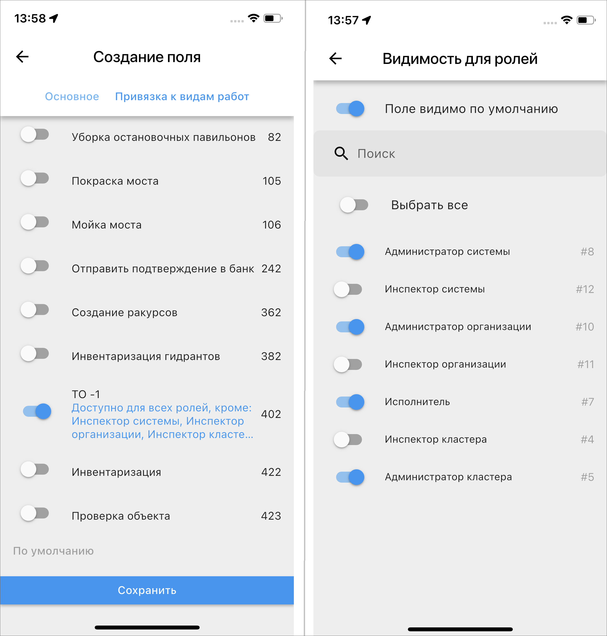 Для каждого вида работ можно настроить видимость поля по ролям. Для этого раскройте вид работ и отметьте те роли, которые должны видеть поле. По умолчанию поле видят все роли.