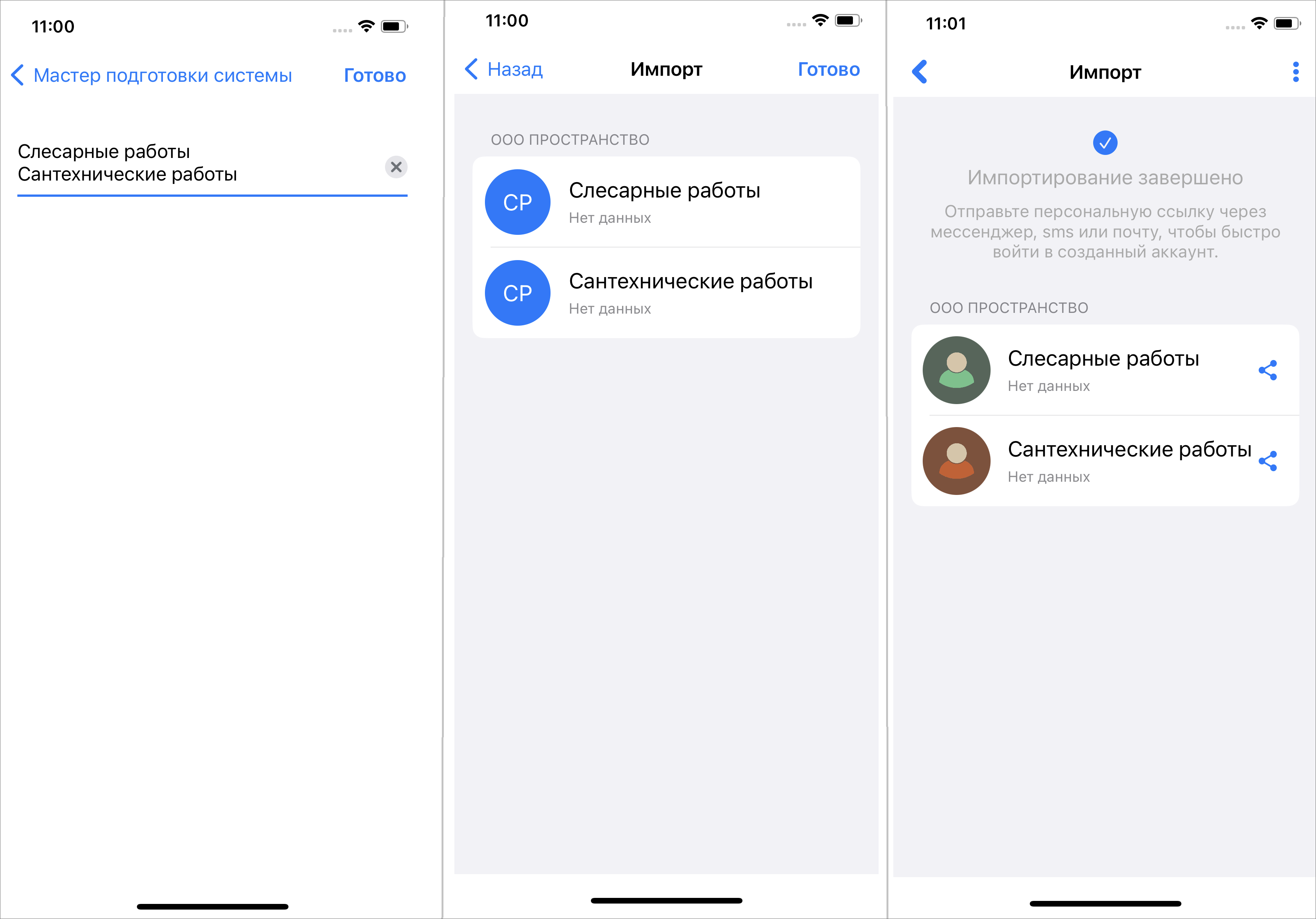 Импорт из книги контактов представляет собой выбор контактов, которые нужно импортировать из контактов на устройстве пользователя. Однократно нужно выдать разрешение на доступ приложения к контактам. В окне мастера следует нажать «Выбрать», далее отметить все контакты, которые нужно импортировать, и нажать «Готово» (на этой кнопке будет указано количество импортируемых контактов). В окне импорта нажать «Готово». После этого появится сообщение, что импортирование завершено, и станут доступны ссылки-приглашения для сотрудников (Рис. 2.4). По этим ссылкам сотрудники смогут авторизоваться в приложении без ввода сервера и логина/пароля.