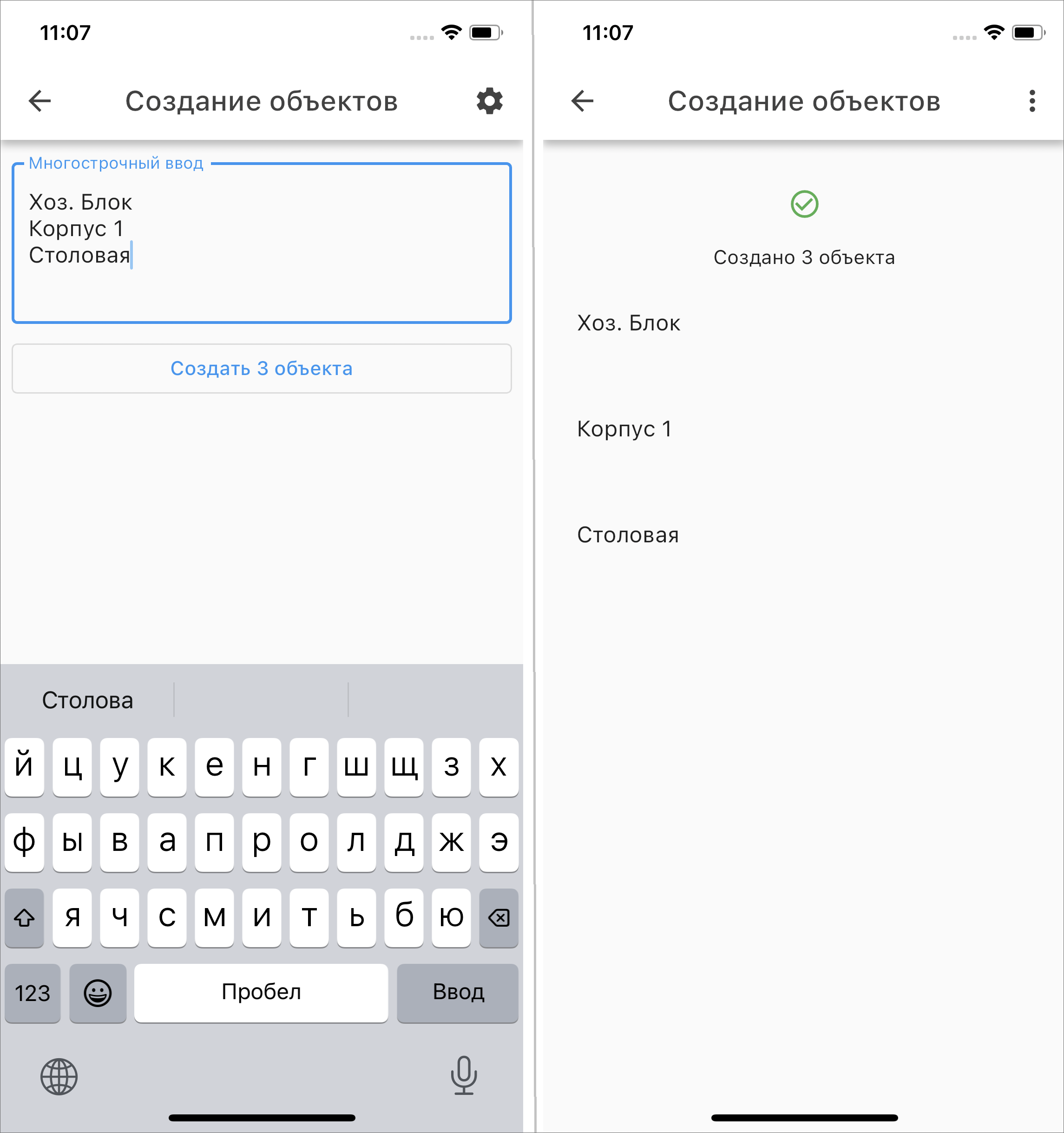 При импорте объектов откроется окно массового создания объектов, где указываются наименования объектов (Рис. 2.8). Разделитель между объектами настраивается при нажатии на шестеренку, по умолчанию это перенос строки.