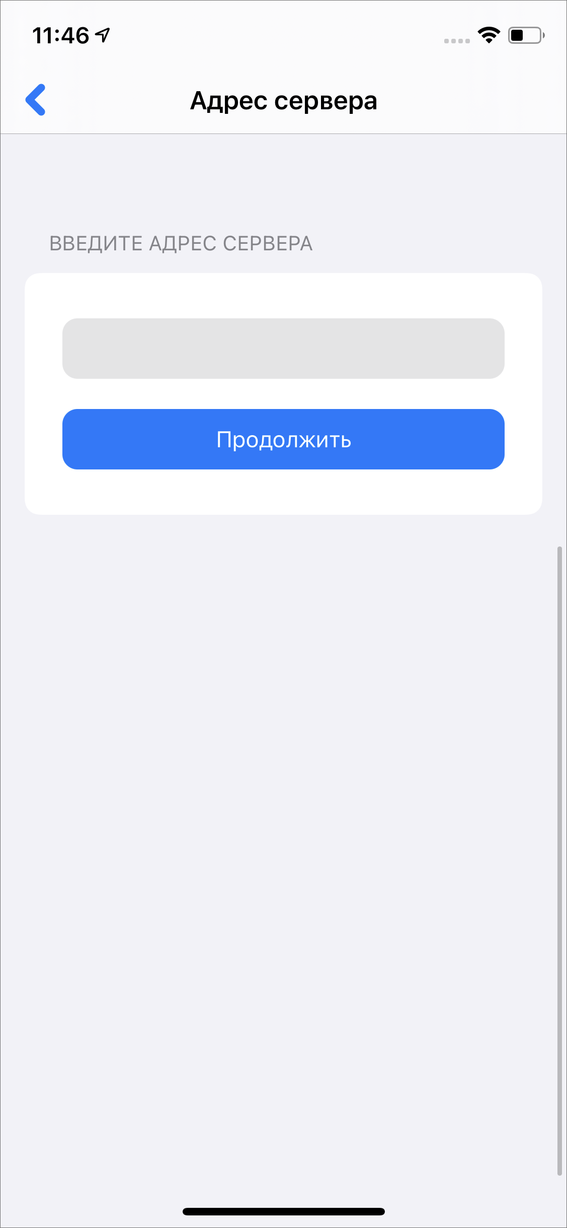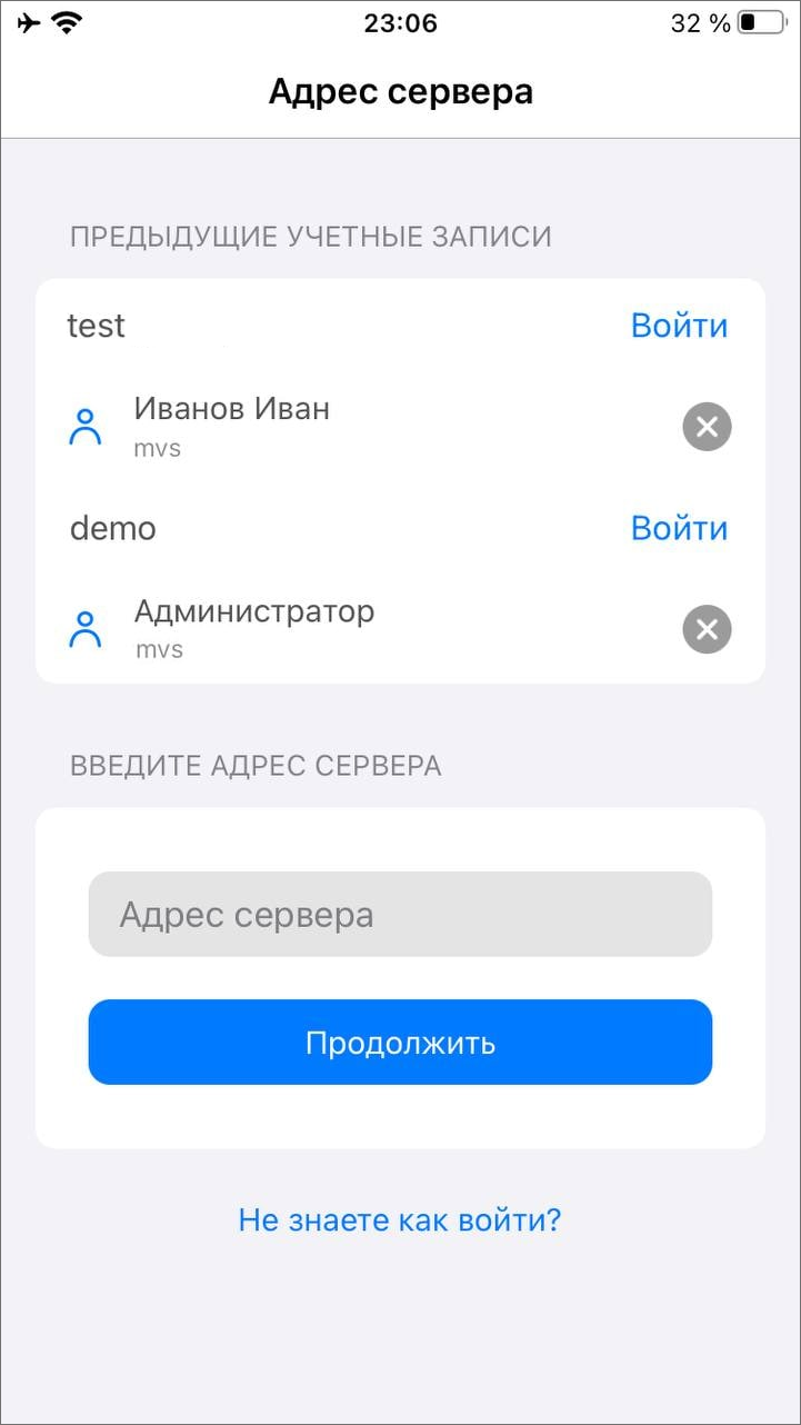 Для стандартной авторизации после запуска приложения следует нажать «Войти в систему», ввести в открывшемся окне адрес сервера (Рис. 2.13) и нажать «Продолжить»:
