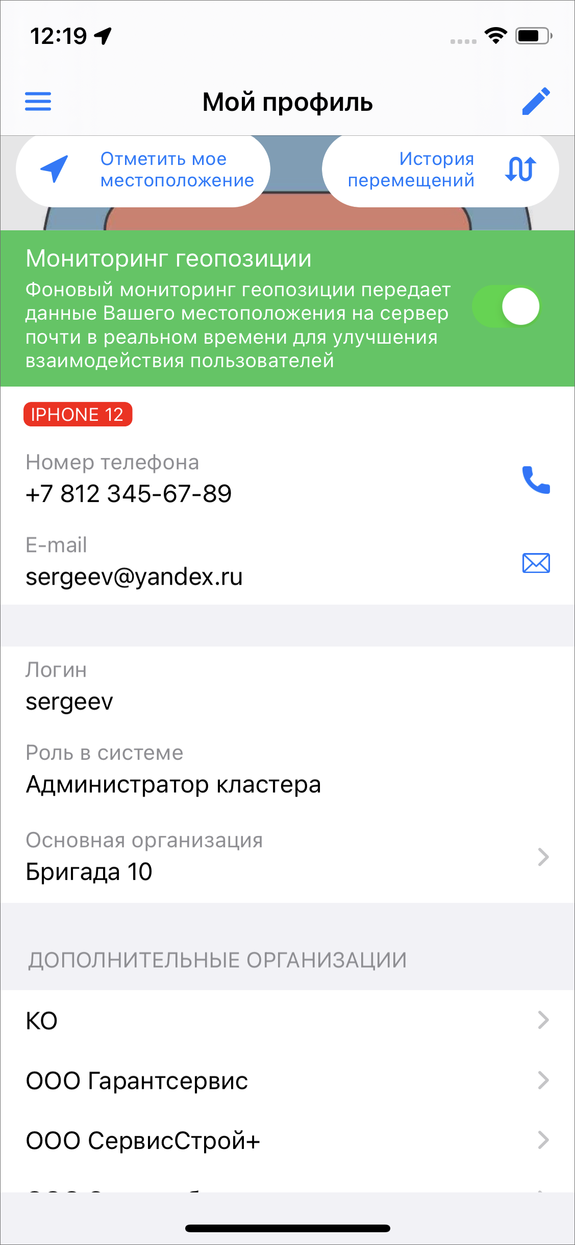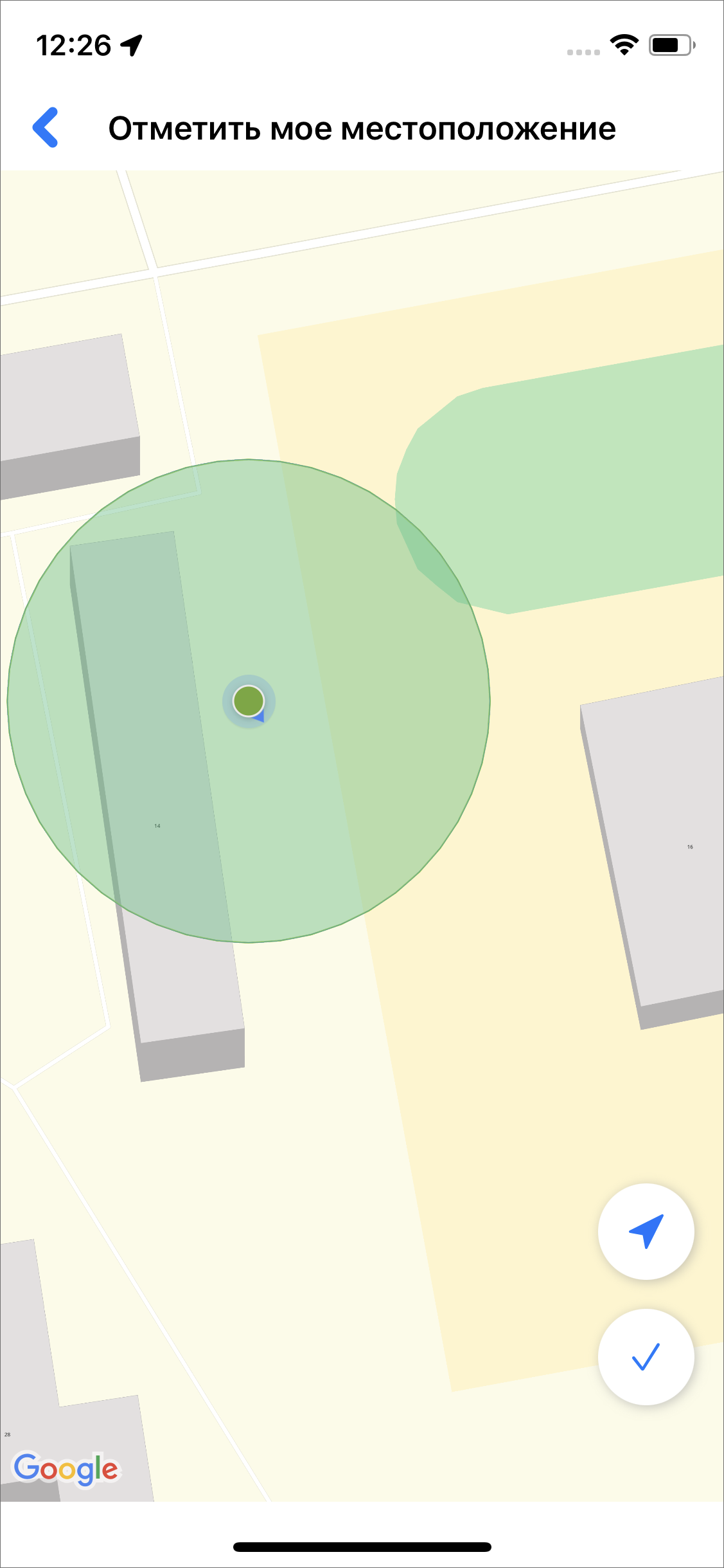 В окне карточки пользователя можно включить или отключить фоновый мониторинг геопозиции. Кроме того, в данном разделе можно уточнить свое местоположение с помощью кнопки «Отметить мое местоположение». При нажатии на кнопку откроется окно карты, в котором будет отображаться местоположение пользователя (Рис. 2.19). Для того чтобы отметка местоположения переместилась в точку фактического нахождения пользователя, нужно нажать . При успешном определении местоположения пользователя метка станет зеленой и в окне появится кнопка подтверждения , при нажатии на которую происходит сохранение координат и переход обратно в окно карточки пользователя. В случае, если местоположение определить не удается, метка будет серой и внизу окна появится сообщение об ожидании отклика служб геолокации. Если при определении местоположения велика погрешность, то метка будет красной и появится сообщение о превышении допустимой погрешности.