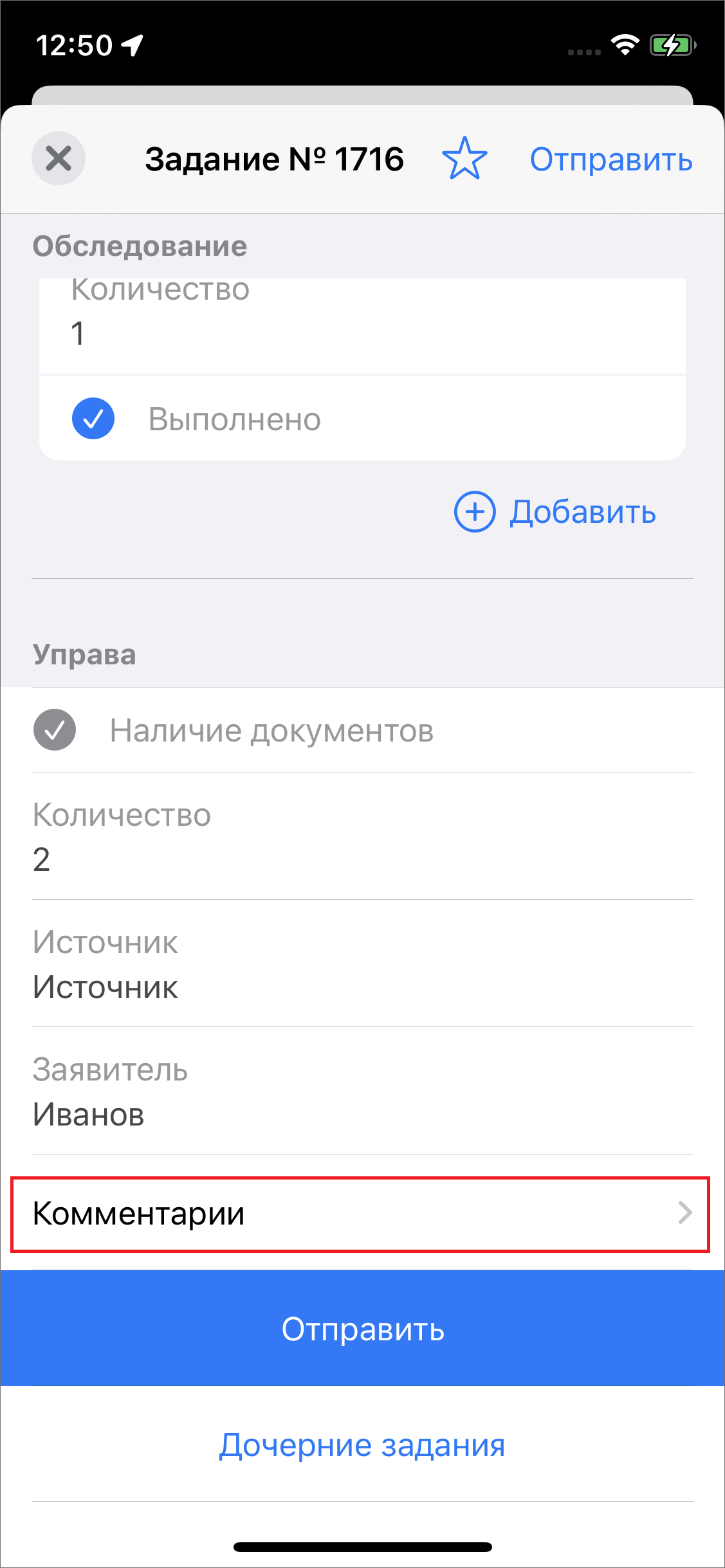 При необходимости можно отредактировать настраиваемые атрибутивные поля (в зависимости от формата поля — ввести другие значения, выбрать значения из списков). Редактировать можно в том числе поле формата геометрия. Для отправки добавленного задания на сервер необходимо выбрать пункт меню «Отправить».