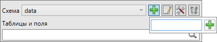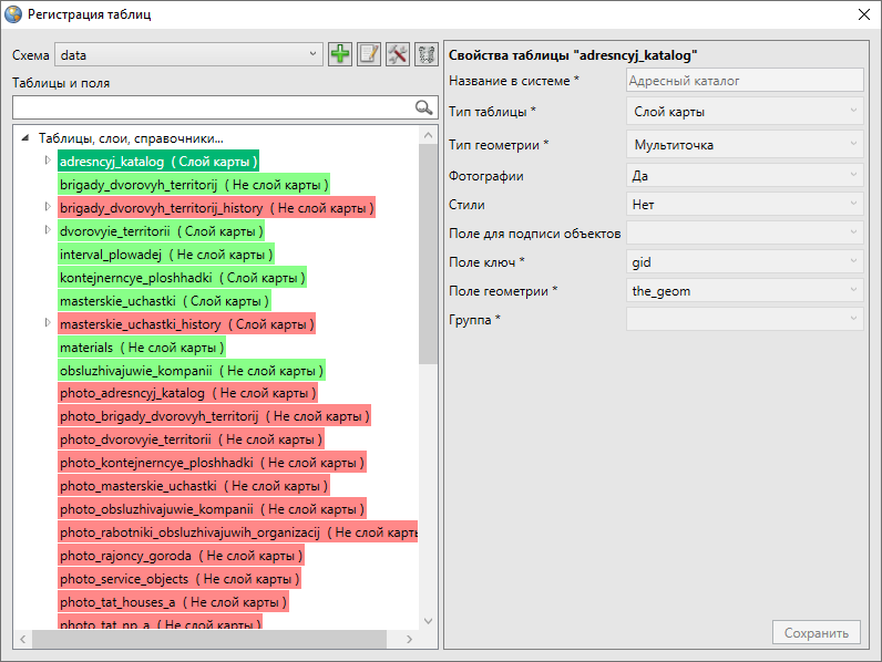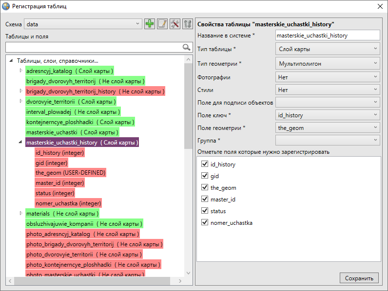 При выборе схемы из выпадающего списка в разделе «Таблицы и поля» отобразится список всех таблиц схемы (в том числе и удаленных не безвозвратно), которые были созданы пользователями Программы. Зеленым цветом в списке выделены существующие на данный момент таблицы, а розовым цветом — удаленные не безвозвратно таблицы. Для открытия списка атрибутивных полей таблицы данных достаточно выделить таблицу в списке двукратным нажатием левой кнопки мыши.