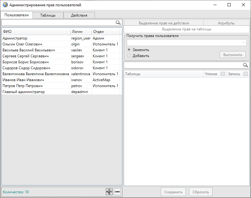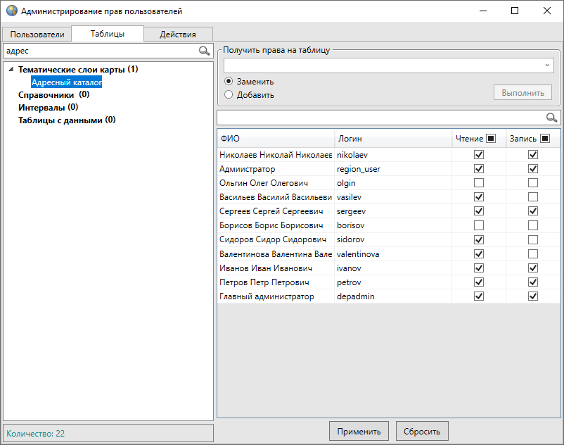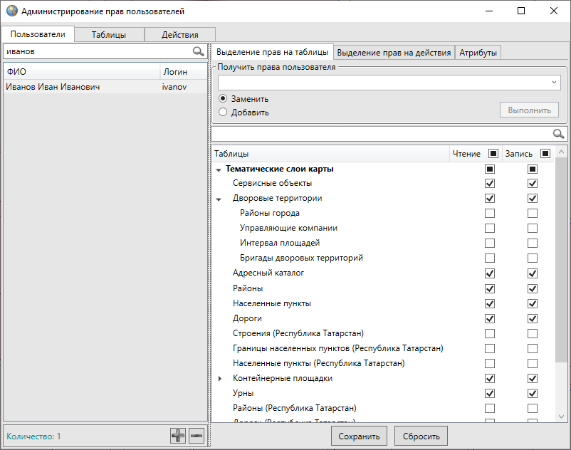 Изменить права пользователя на просмотр и редактирование конкретных таблиц данных или всех таблиц данных выбранного типа можно путем проставления/снятия галочек в соответствующих столбцах и нажатия кнопки «Сохранить». Галочки в заголовках столбцов «Чтение» и «Запись» позволят выделить все таблицы данных для просмотра и редактирования соответственно.