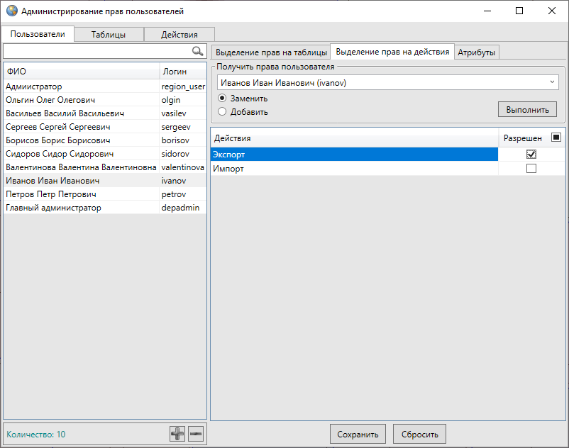 Рис. 2.337 Просмотр и редактирование прав пользователей на действия по экспорту и импорту таблиц