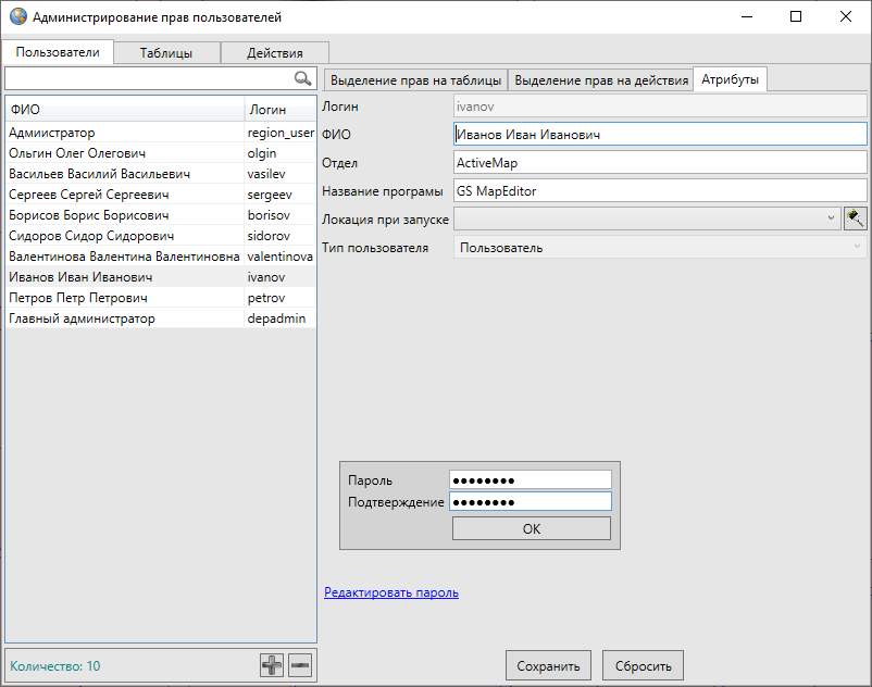 списка тип пользователя («Пользователь» или «Администратор»), с помощью ссылки «Редактировать пароль» создать