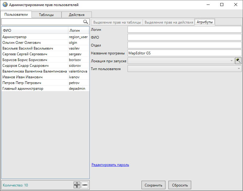 На правах администратора можно изменить персональные данные пользователя, за исключением логина и типа пользователя (пользователь или администратор). Персональные данные — ФИО, отдел, название программы — меняются путем ввода новых данных в соответствующих полях, локация при запуске программы меняется путем выбора наименования локации из выпадающего списка. В списке представлены наименования локаций из справочника локаций (раздел Управление локациями карты).