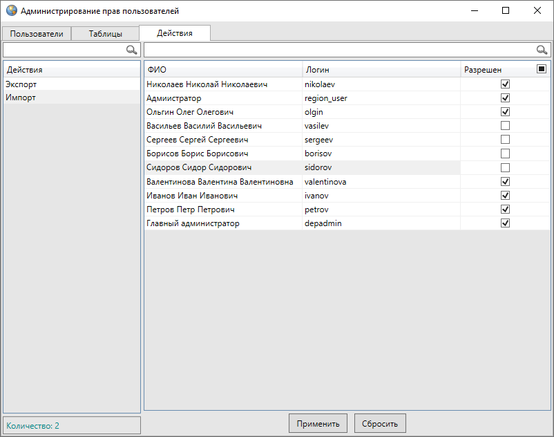 При выборе закладки «Действия» в левой части окна отобразится список действий («Импорт», «Экспорт»), а в правой части окна отобразится список пользователей и их прав на действия. Над списком действий также расположено поле поиска, которое предназначено для поиска необходимых действий в списке. Для изменения прав пользователя на действие достаточно выбрать действие в списке однократным нажатием левой кнопки мыши, затем поставить/снять галочку в строке пользователя столбца «Разрешен».