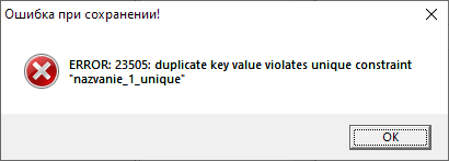 Программа не позволит сохранить объект без заполнения обязательных полей. При настройке уникальности поля Программа не позволит сохранить повторяющиеся значения для разных объектов таблицы, будет выходить соответствующее сообщение об ошибке (Рис. 2.171).