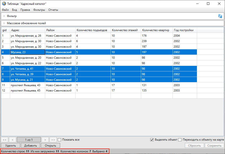 После импорта данных в слой добавятся новые объекты, которым Программа присвоит идентификационные номера. В окне «Таблица» отобразятся строки с данными импортированных объектов.