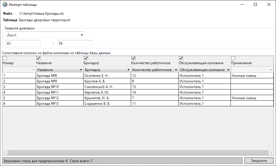 2. При импорте из файлов форматов *.xls, *.xlsx в таблицу данных по слою карты и другим типам таблиц данных для загрузки атрибутивных данных необходимо указать диапазон импортируемых строк и столбцов документа (диапазон задается номером ячейки первой строки первого импортируемого столбца и номером ячейки последней строки последнего импортируемого столбца) и задать соответствие колонок таблицы с данными из файла колонкам рассматриваемой таблицы (Рис. 2.213).