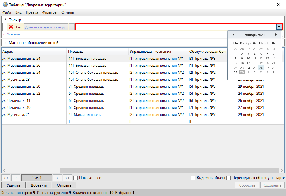 Для фильтрации информации необходимо выбрать атрибутивное поле, ввести (выбрать) в поле поиска интересующий параметр и выбрать вариант вхождения введенного символа в указанное атрибутивное поле («Содержит», «Не содержит», «=», «<>» («не равно»), «>=», «>», «<», «<=», «В начале», «В конце», «Пустое», «Не пустое») и нажать клавишу «Enter» или кнопку «Обновить данные». В таблице отобразится список объектов, удовлетворяющих заданным условиям поиска (Рис. 2.221).