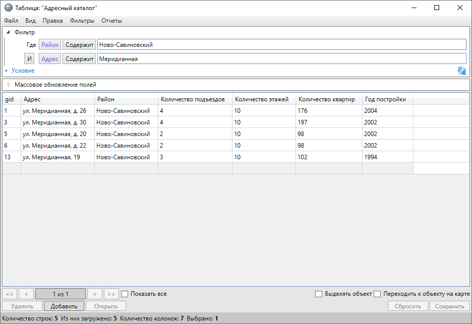 В нижней части окна «Таблица» расположены кнопки «Удалить», «Добавить», «Открыть», предназначенные для редактирования объектов таблицы (раздел Изменение данных в таблице).