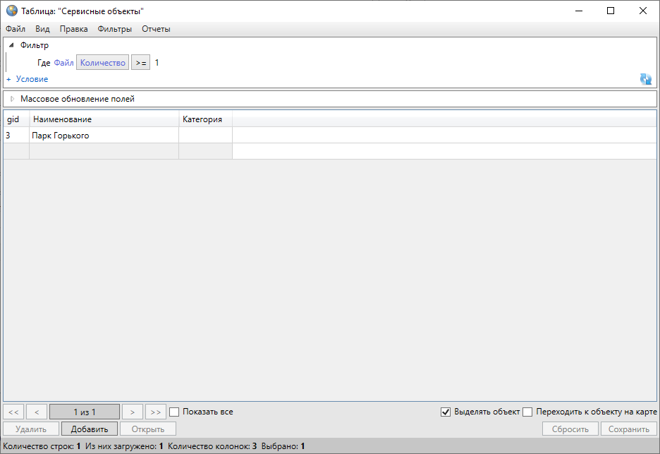 Если таблица с данными является слоем карты, то галочка в поле «Выделять объект» и выбор объекта в таблице (однократным нажатием левой кнопки мыши) обеспечит выделение объекта на карте контрастным цветом. Галочка в поле «Переходить к объекту на карте» и выбор объекта в таблице обеспечит переход к объекту на карте и его выделение контрастным цветом. При включении функций «Выделять объект» или «Переходить к объекту на карте» слой автоматически становится видимым. По умолчанию функции выделения объекта и перехода к объекту на карте выключены.
