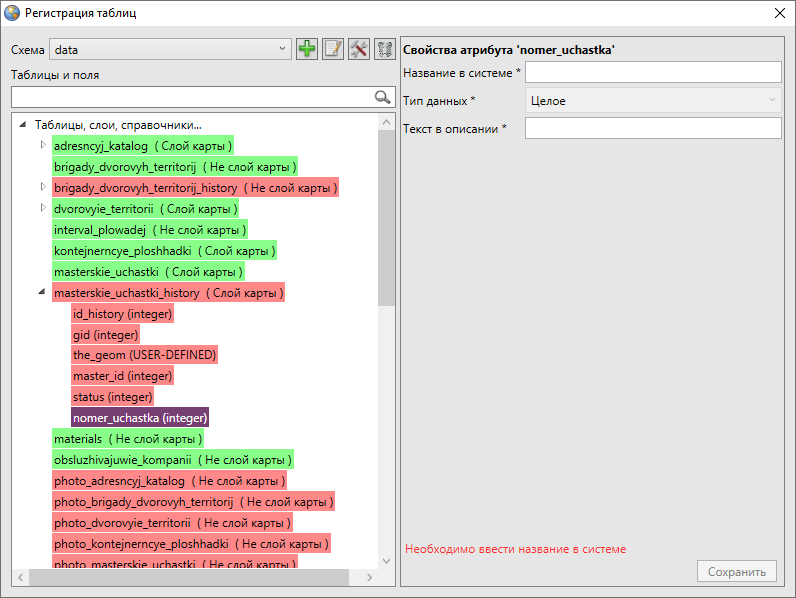 Для восстановления таблиц данных и атрибутивных полей нужно выделить таблицу (поле) однократным нажатием левой кнопки мыши. В правой части окна отобразится информация о таблице или атрибуте («Свойства таблицы» или «Свойства атрибута»; Рис. 2.340, Рис. 2.341). Для восстановления таблицы (поля) необходимо заполнить все пустые поля данного окна, помеченные звездочкой. При восстановлении таблицы необходимо также отметить галочкой атрибутивные поля слоя, которые нужно восстановить. Далее нужно нажать кнопку «Сохранить».